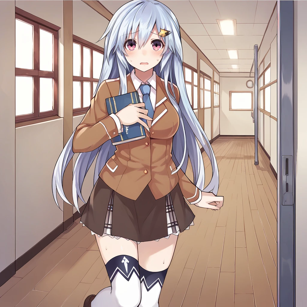 Tia_Sch, school uniform, alt white thighhighs, short skirt, brown blazer, blue necktie, white shirt, collared shirt, long sleeves, brown sleeves, hairclip, brown skirt, Folder 002