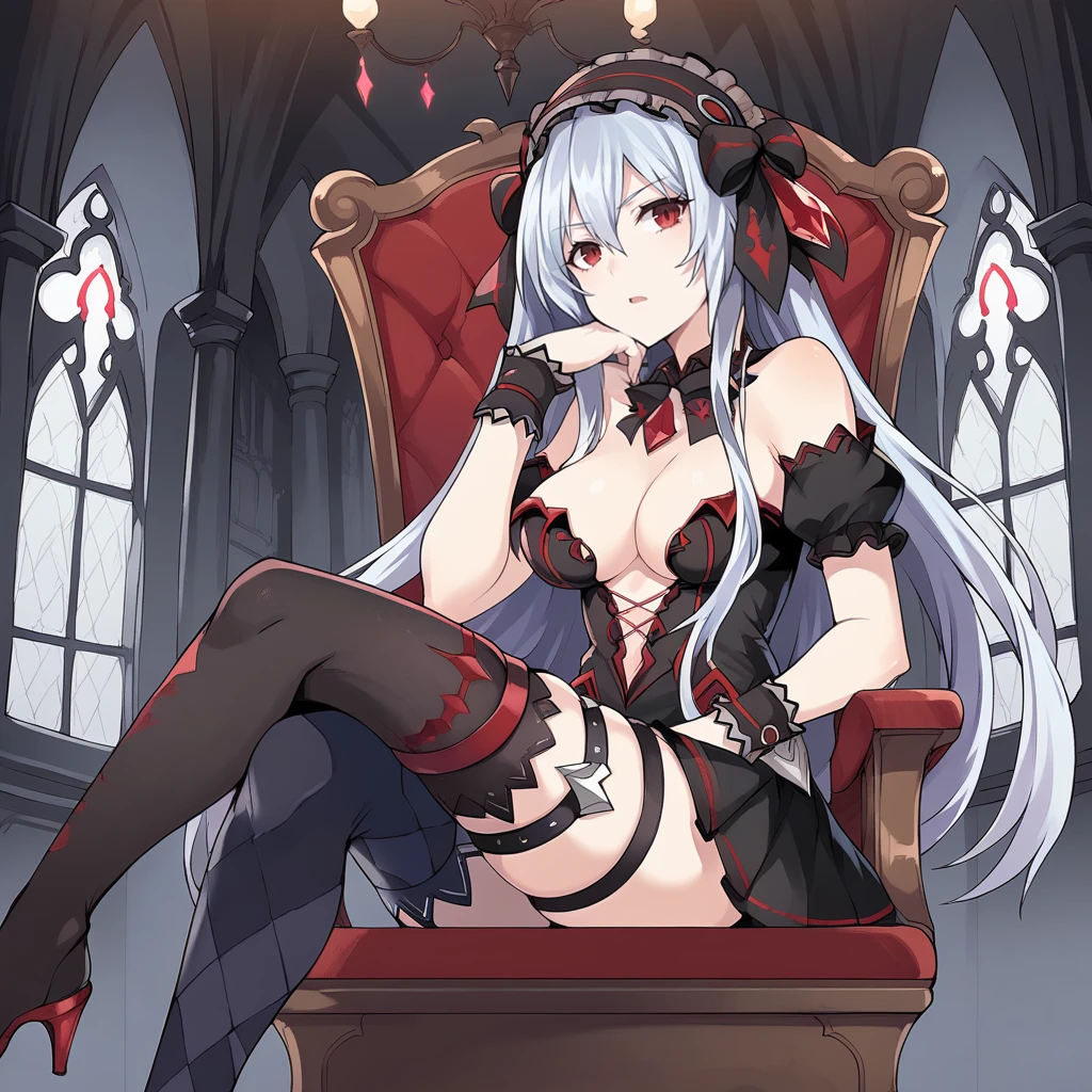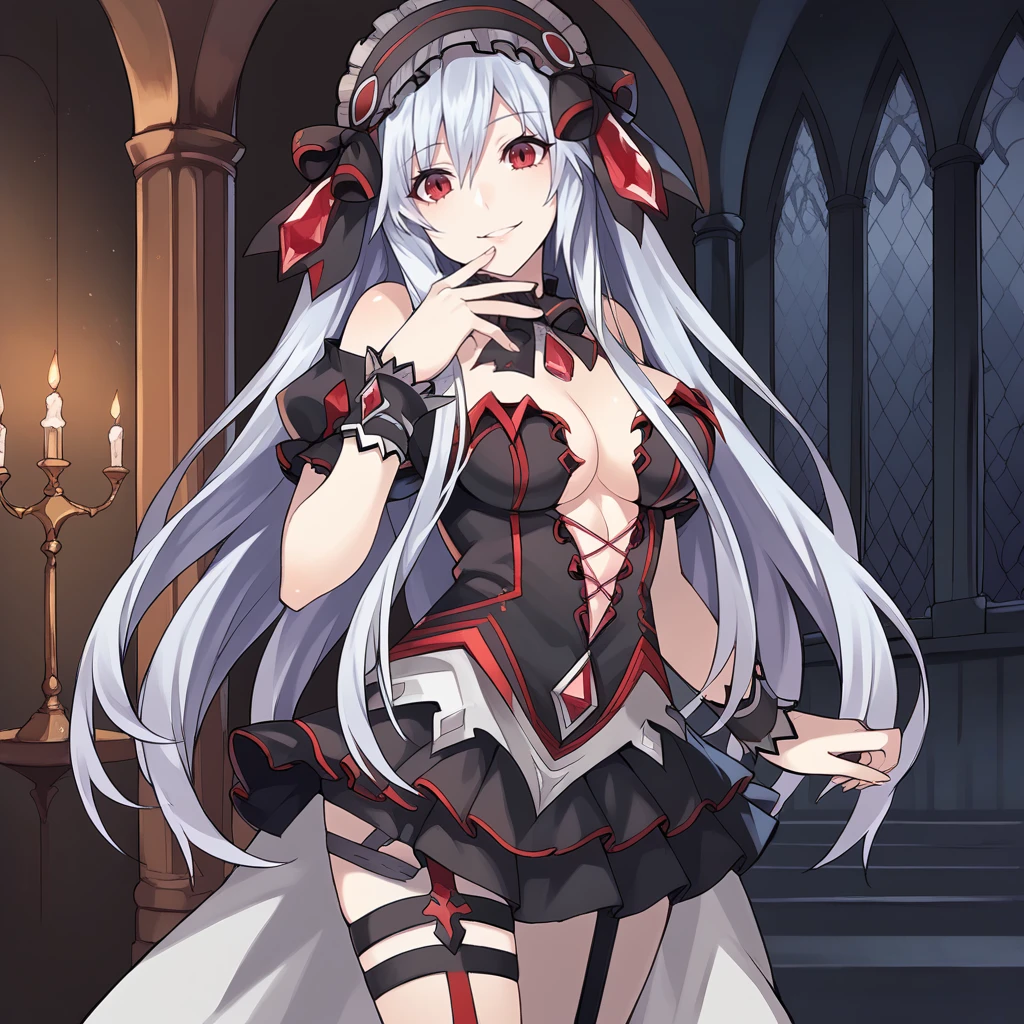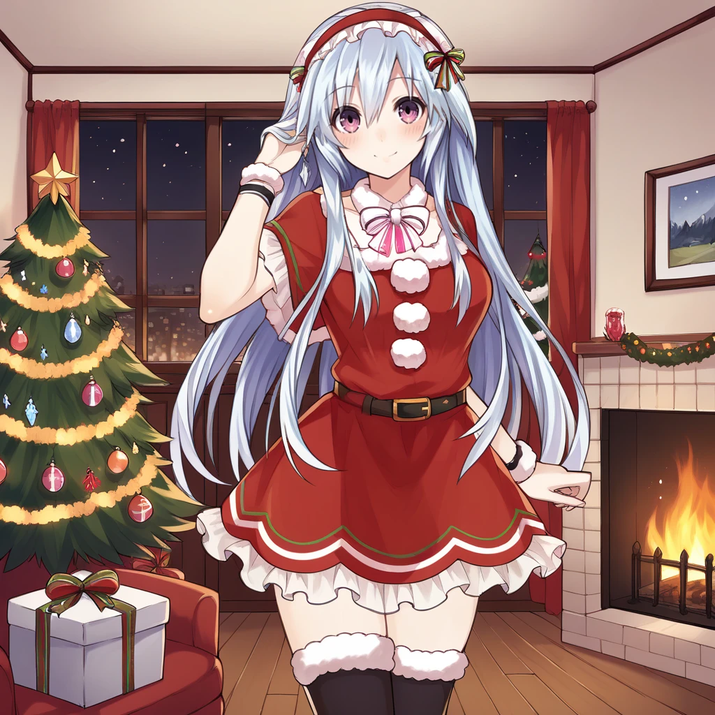 Tia_Evl01, red eyes, alt lolita hairband, red gem, jewelry, strapless dress, alt pleated skirt, garter strap, bare shoulders, alt black dress, alternate black skirt, red trim, asymmetrical legwear, mismatched thighhighs, alt black thighhighs, alt thigh strap, detached sleeves, alt short sleeves, puffy sleeves, black wrist cuffs, center opening, cleavage, alt detached collar, black bowtie, black bow,Xmas Outfit:
