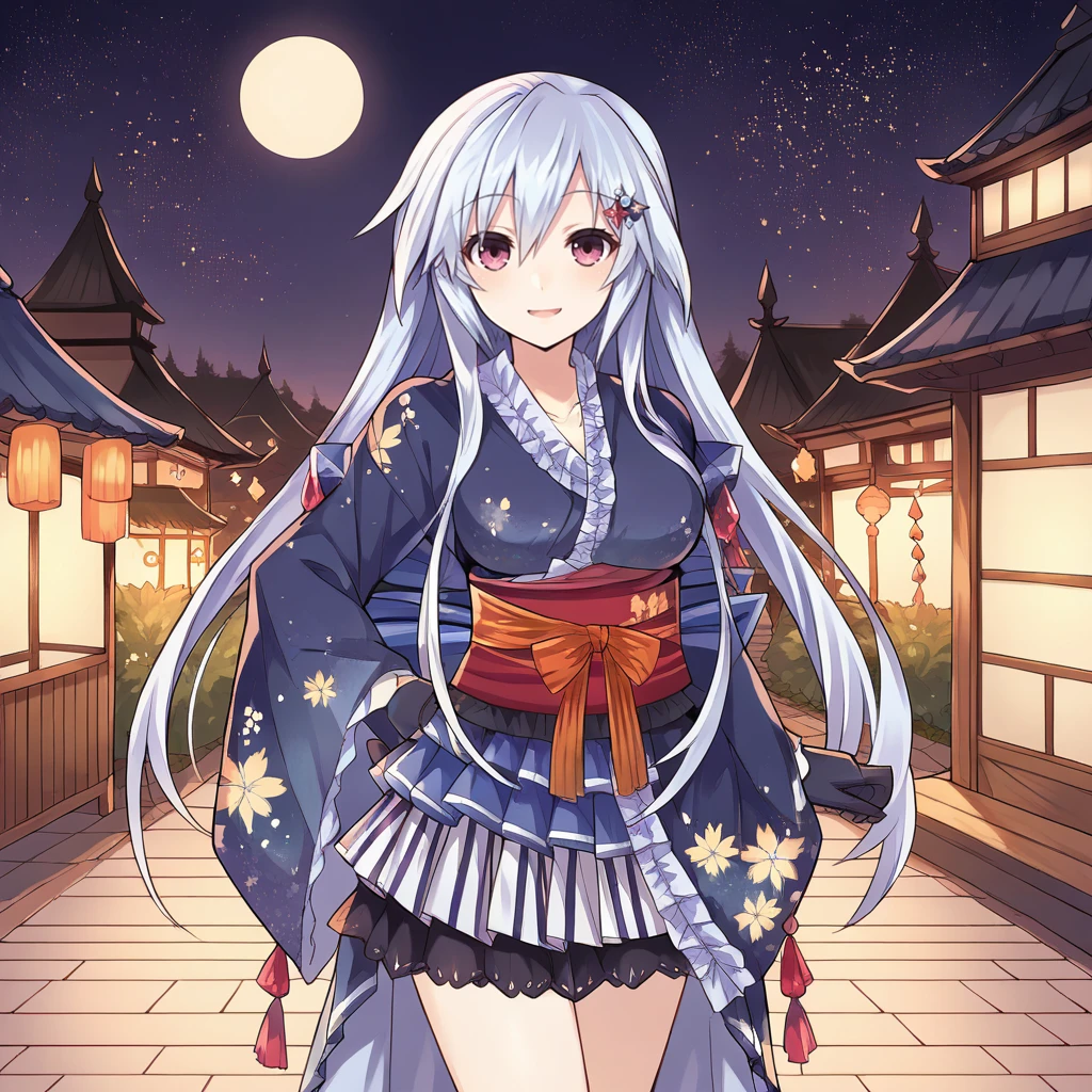 Tia_JP, japanese clothes, red sash, sash, orange bow, striped skirt, alternate frilled skirt, alt layered skirt, alt blue skirt, purple skirt, floral print, black gloves, short kimono, frilled kimono, kimono skirt, blue kimono, striped, hair ornament,Folder 003