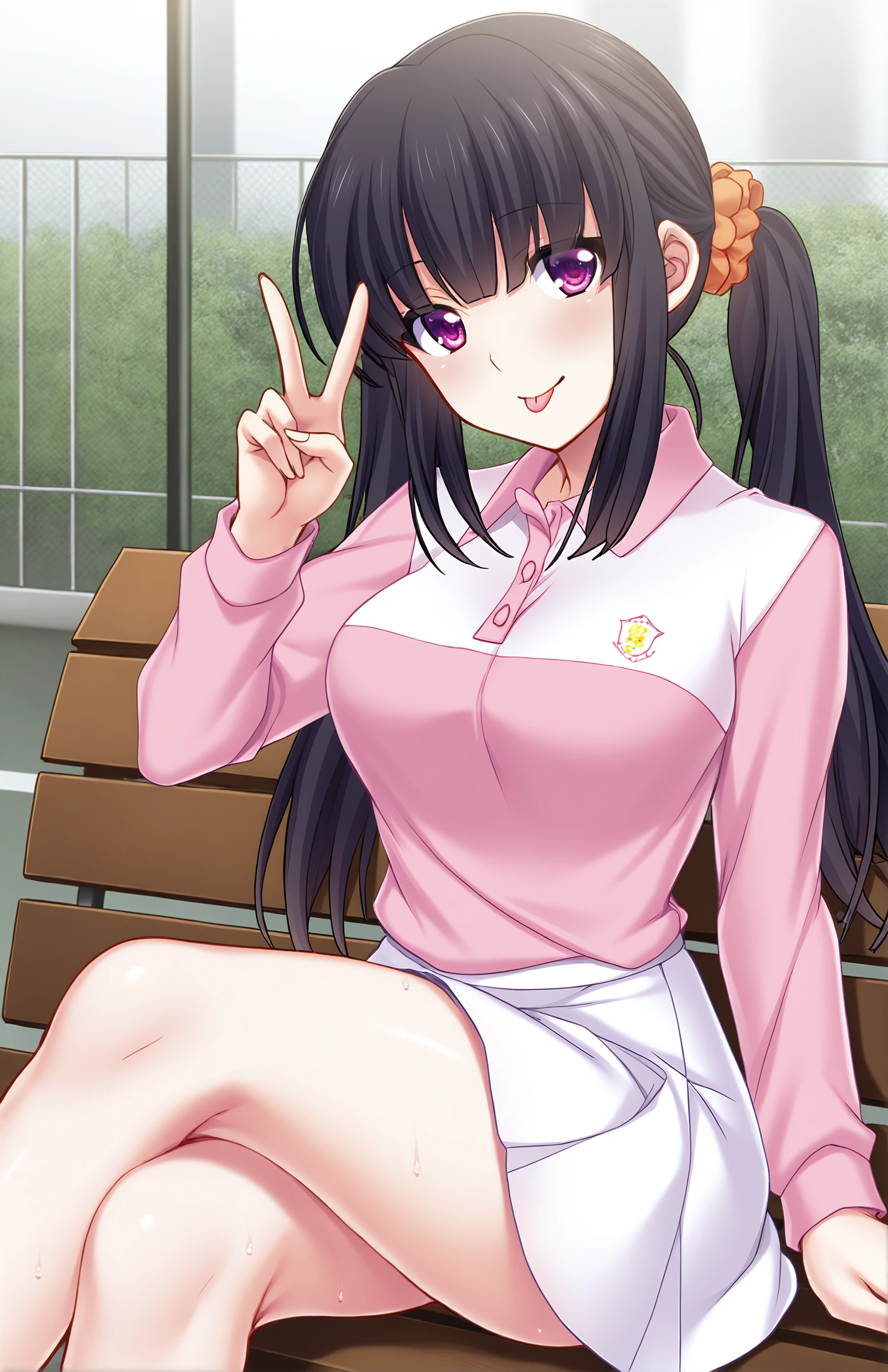 YoshinoAiri, long hair, , skirt, polo shirt, pink polo, long sleeves, black hair, twintails, purple eyes, pink eyes, scrunchie, white skirt