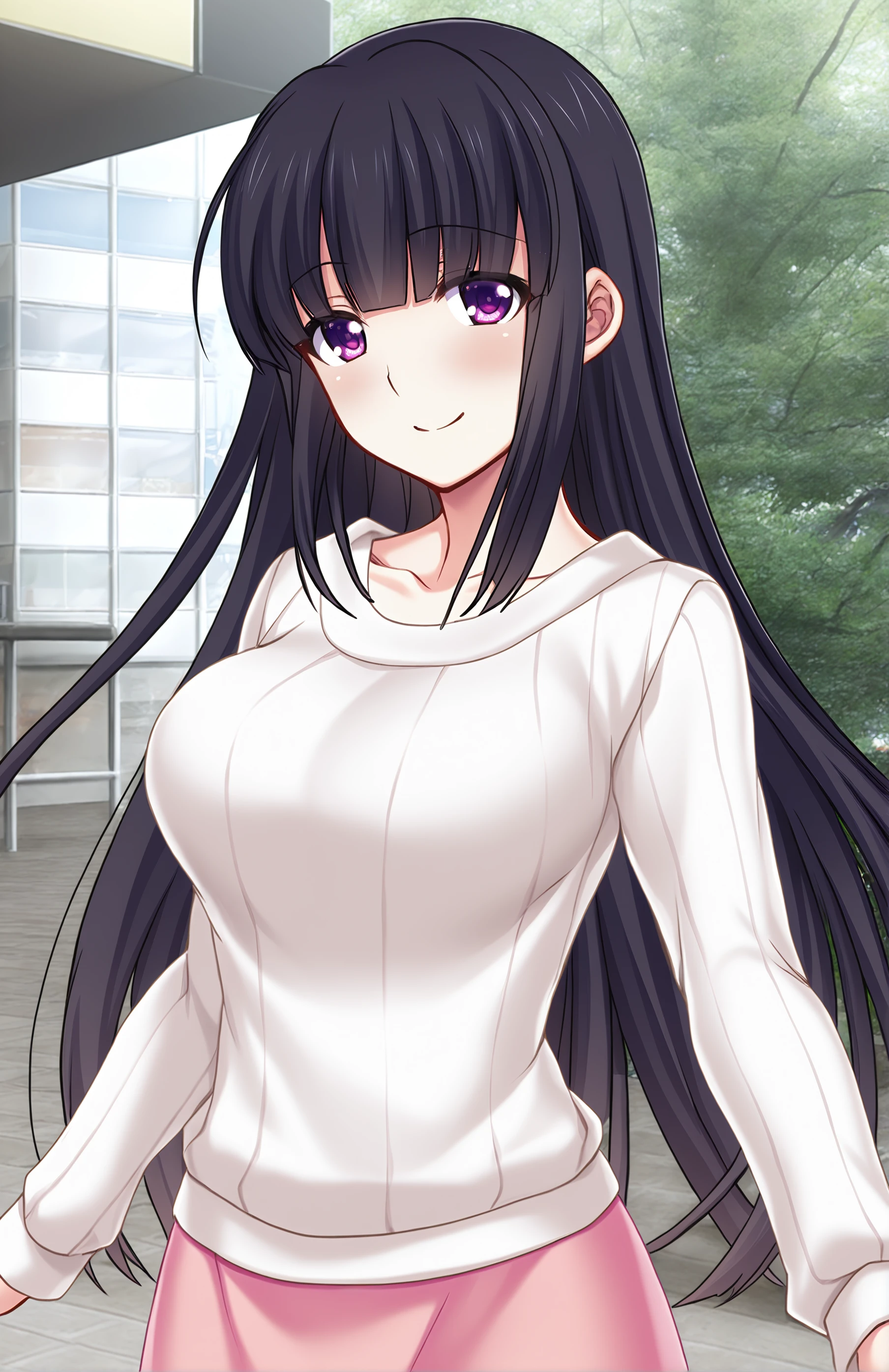YoshinoAiri, long hair, , bangs, skirt, , black hair, long sleeves, collarbone, purple eyes, alternate costume, blunt bangs, sweater, casual, pink skirt, white sweater
