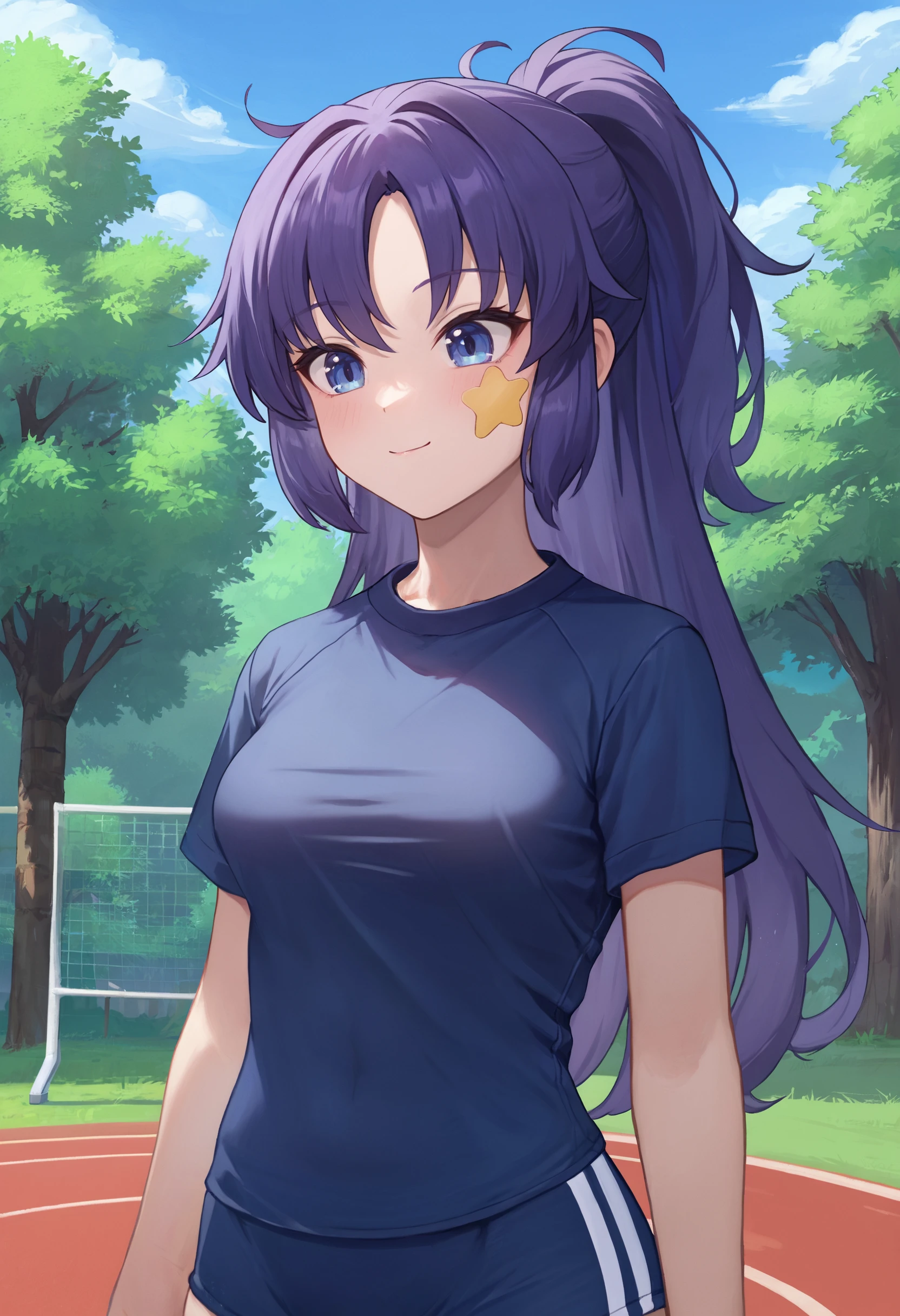 hayase yuuka, ponytail, gym uniform, sticker on face