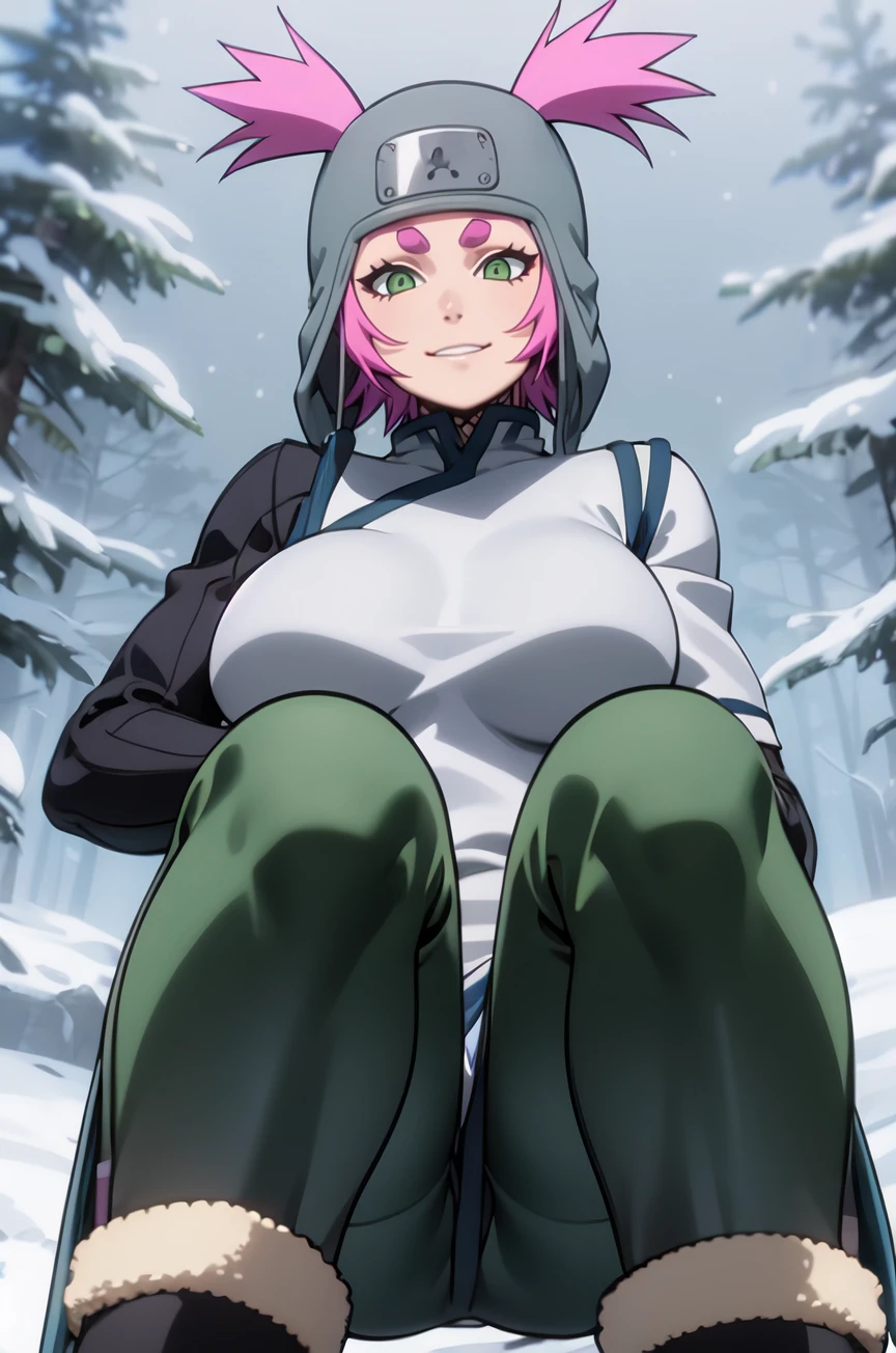 Kakuyoku Fubuki, spiky hair, short hair, short twintails, pink hair, green eyes, short eyebrows, pink eyebrows, hikimayu, beige leg warmers, forehead protector, grey hat, white fingerless gloves, grey cheongsam, bluish green pants, large breasts