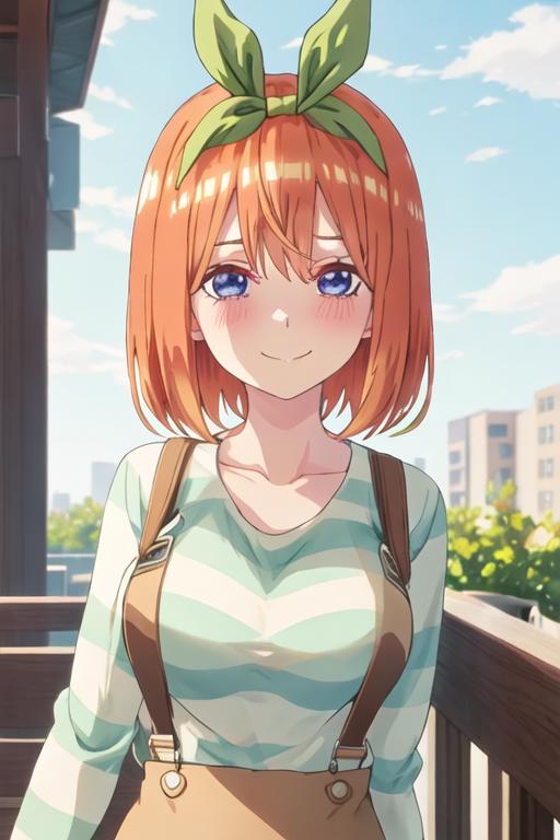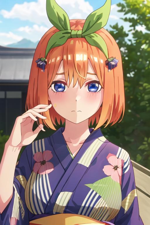 The trigger word is nakano_yotsuba_gotoubunnohanayome, and the recommended tags are best quality, masterpiece, highres, solo, {nakano_yotsuba_gotoubunnohanayome:1.15}, orange_hair, bangs, ribbon, green_ribbon, hair_ribbon, blush, hair_between_eyes, blue_eyes, short_hair, eyebrows_hidden_by_hair, closed_mouth.