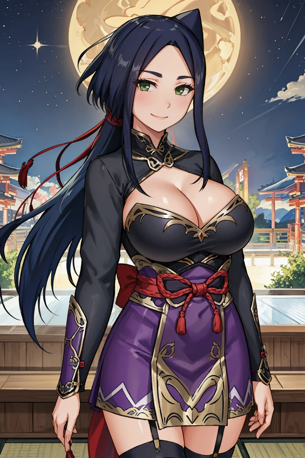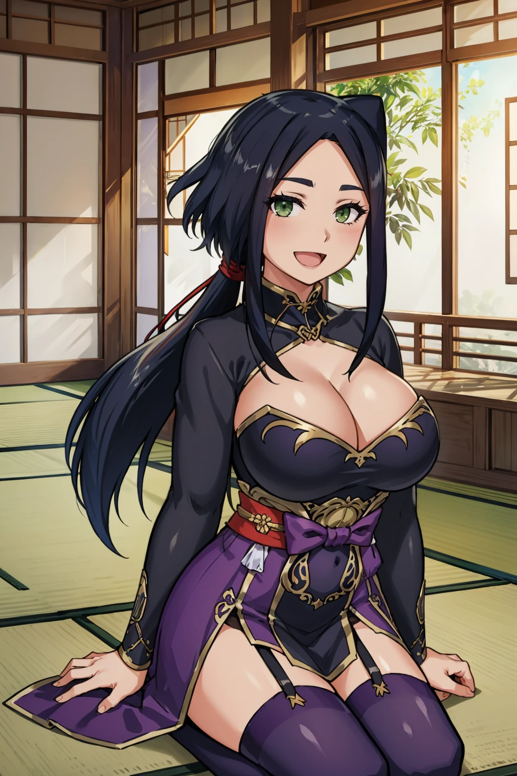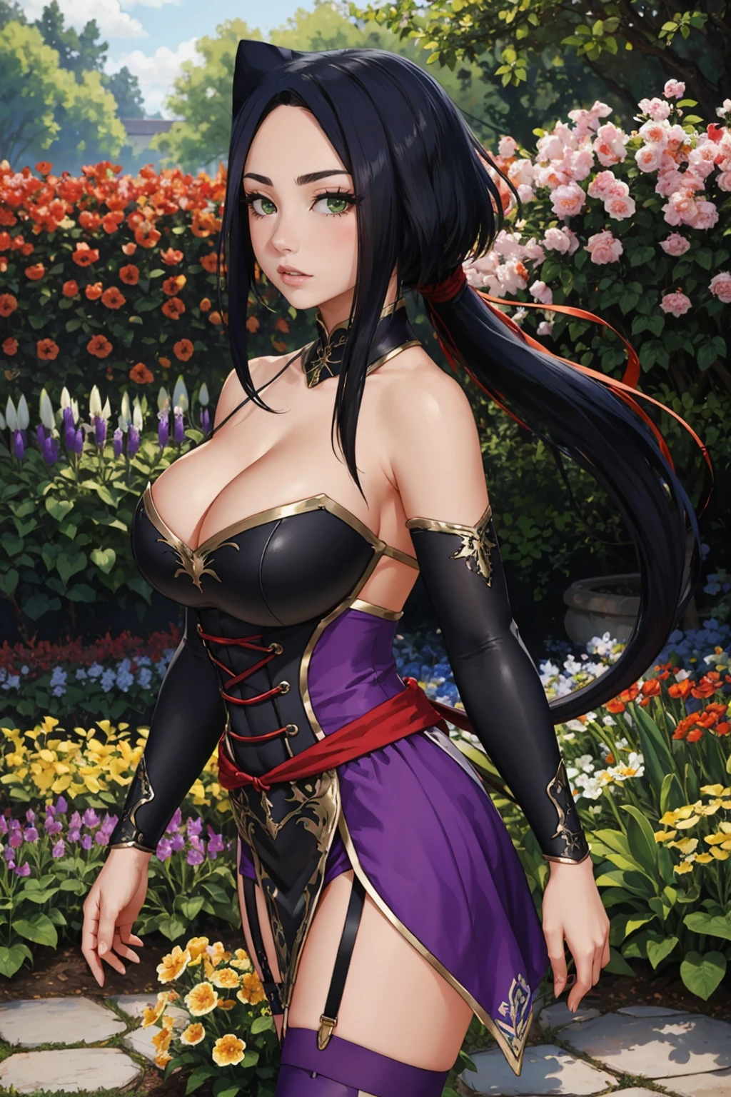 Add "black and purple dress, cleavage cutout, pelvic curtain, arm guards, purple thighhighs" for her ninja outfit.