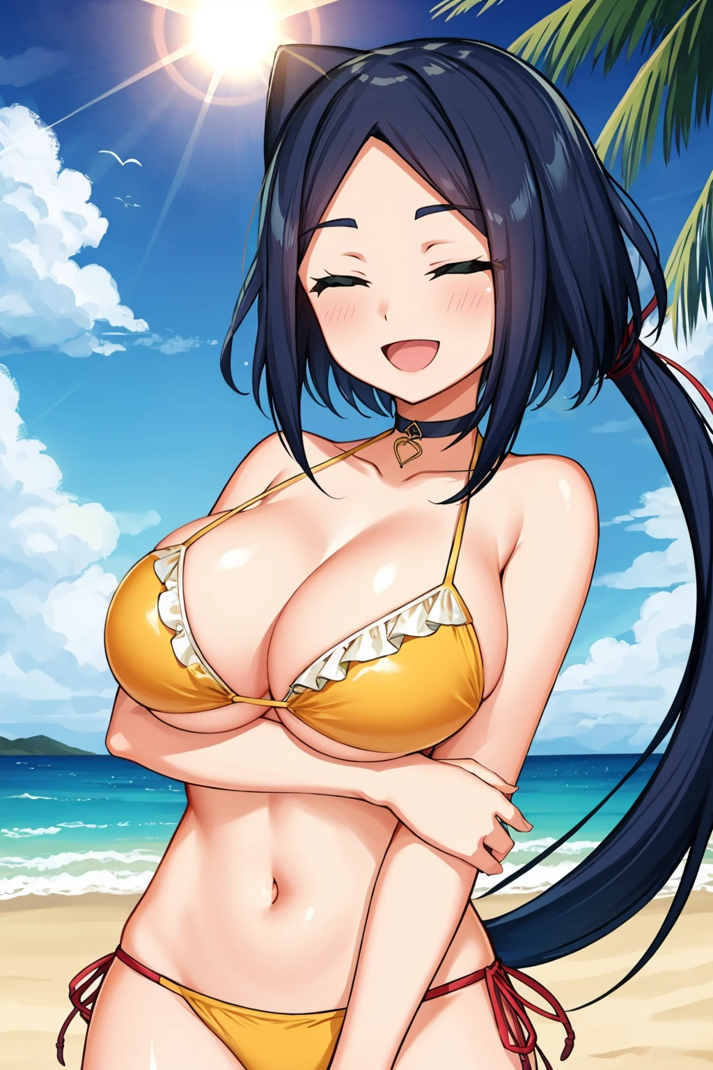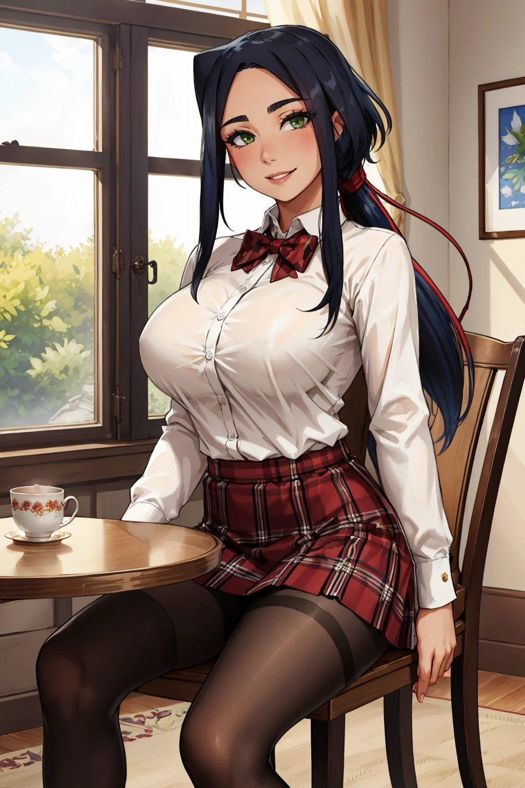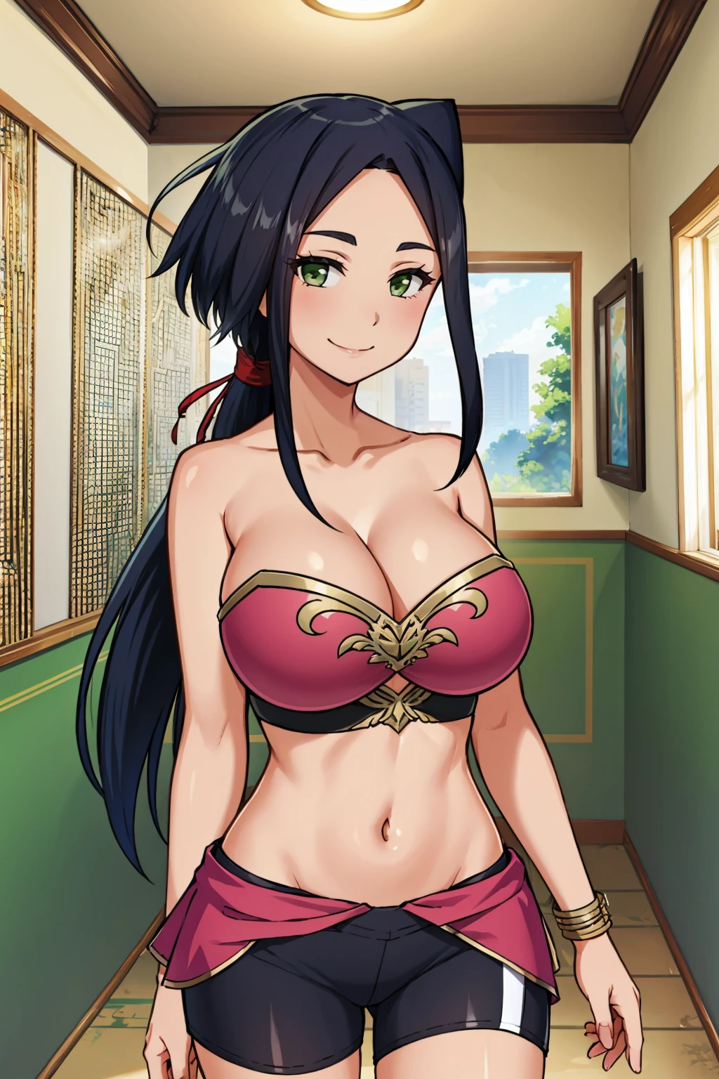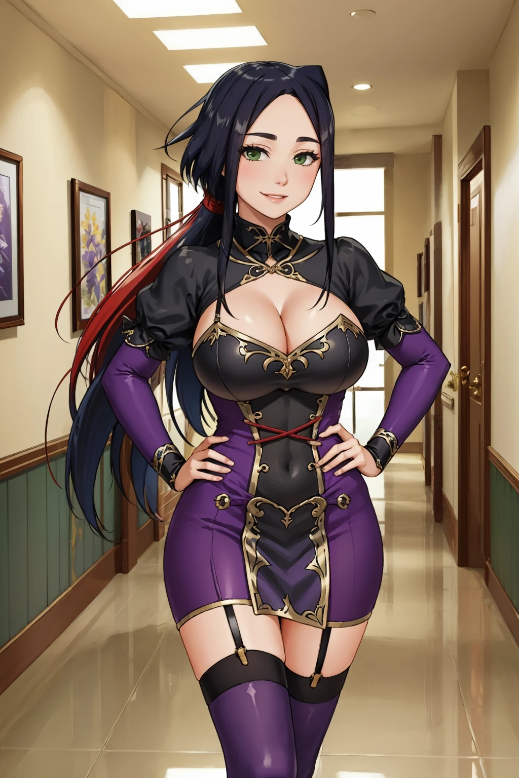 Add "black and purple dress, cleavage cutout, pelvic curtain, arm guards, purple thighhighs" for her ninja outfit.