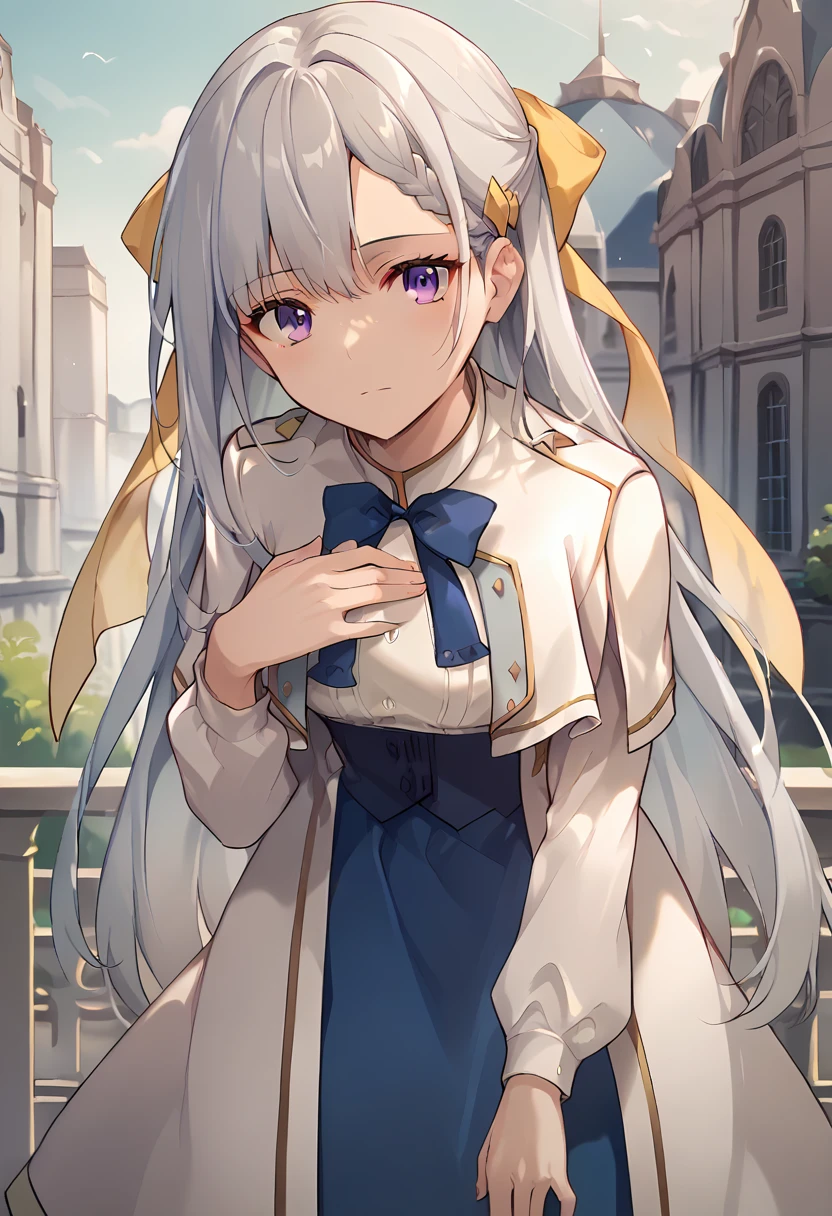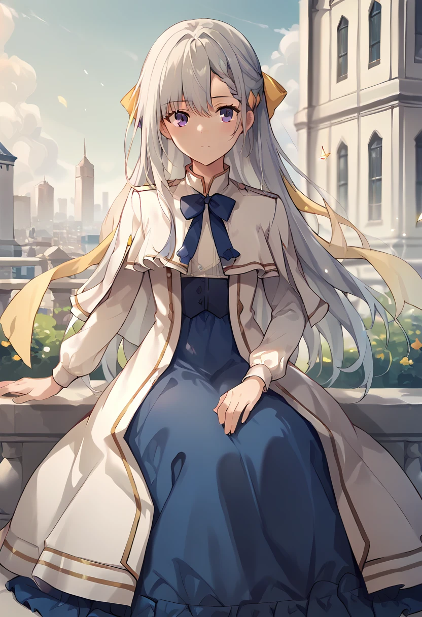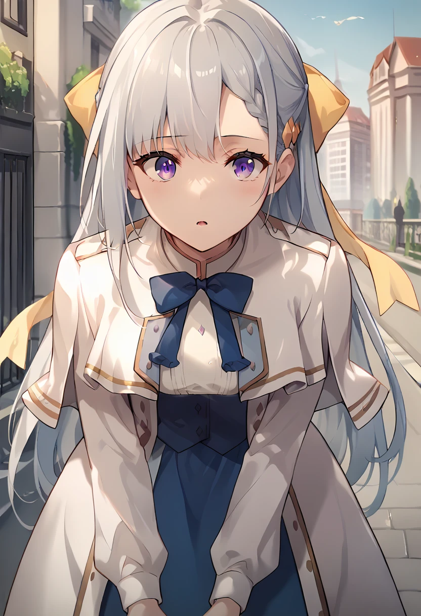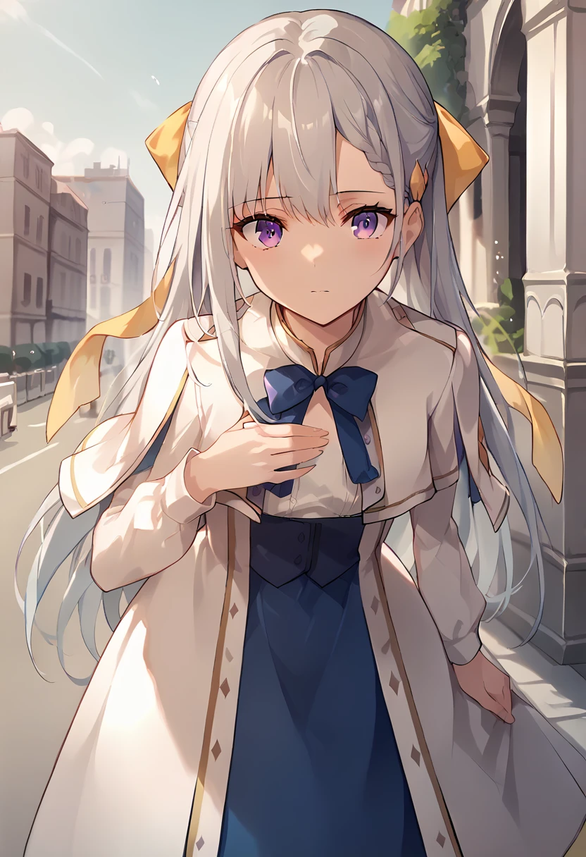 score_9, score_8_up, score_7_up, source_anime, masterpiece, 1girl, ctianeuphy, blue dress, white jacket, neck ribbon, long sleeves, looking at viewer, outdoors, city, leaning forward, chestnut mouth, anime coloring,Negative prompt ❌: