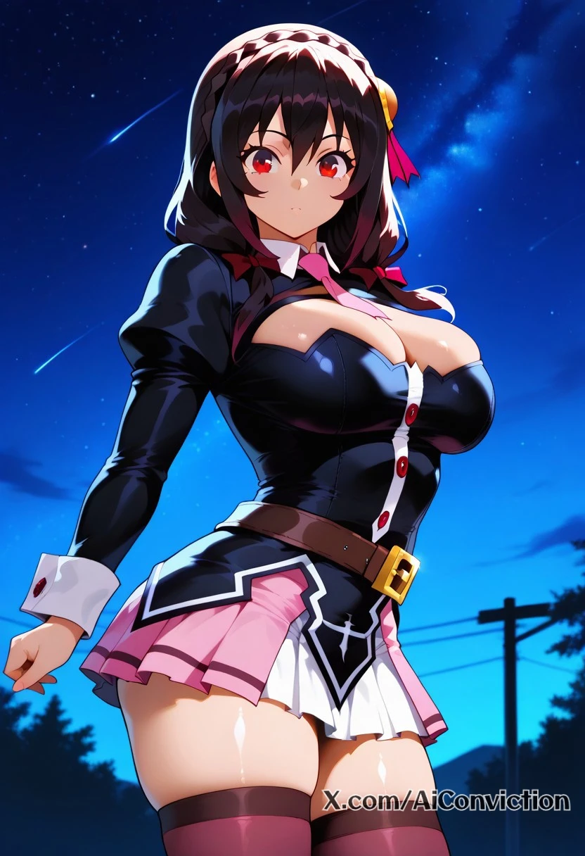 Yunyun, (Konosuba), black hair, hair ornament, red eyes, bow, braid, crown braid, skirt, thighhighs, long sleeves, necktie, belt, clothing cutout, cleavage cutout, pink skirt, pink necktie,