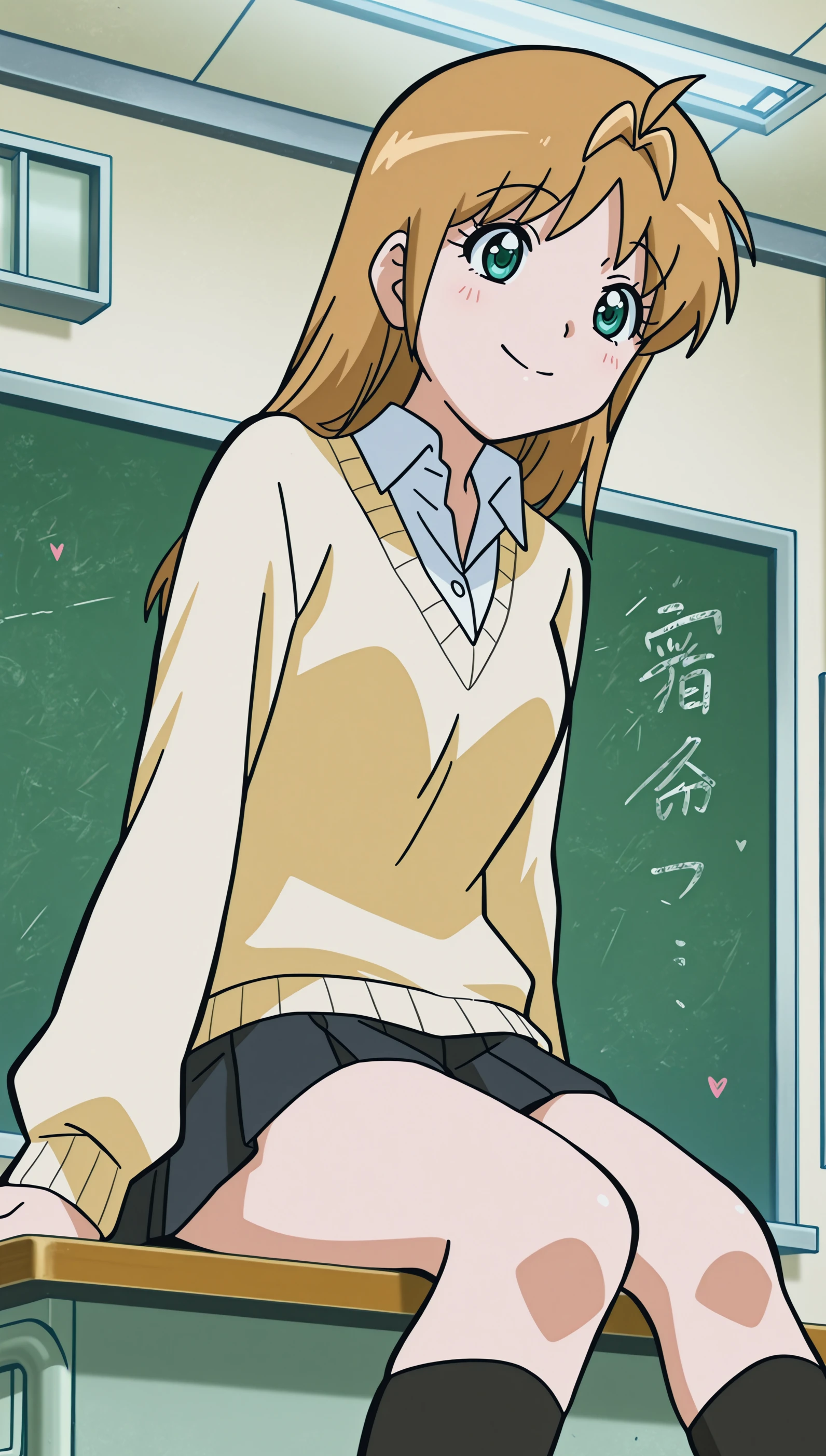 Optionnal Words: school uniform, pleated skirt, sweater, kneehighs