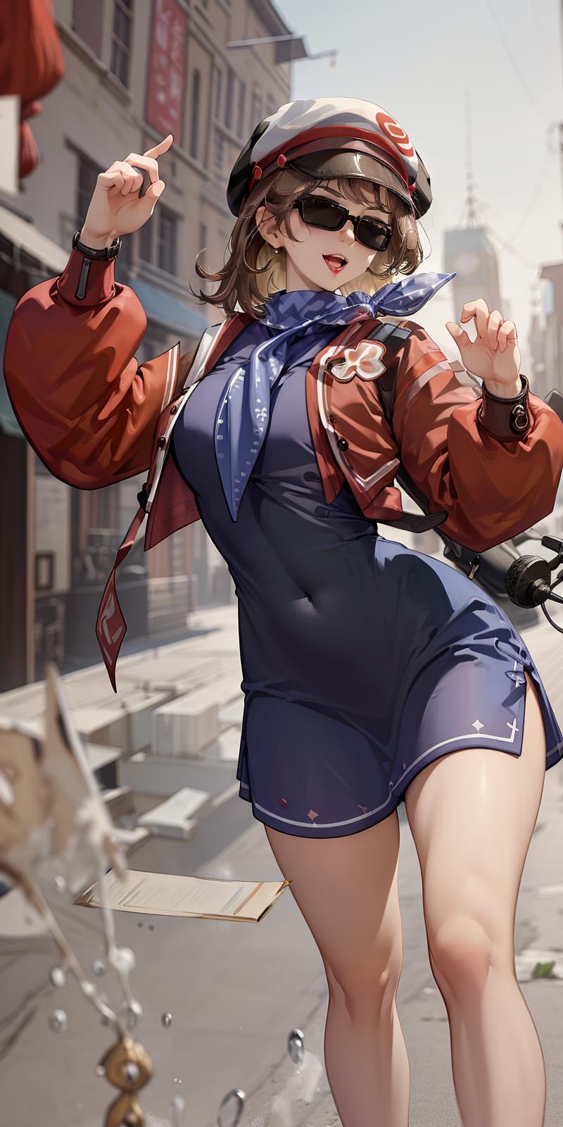 Regulus, short hair, brown hair, long sleeves, dress, jacket, scarf, neckerchief, blue dress, white hat, (sunglasses:1.2), wristwatch, bangs,
