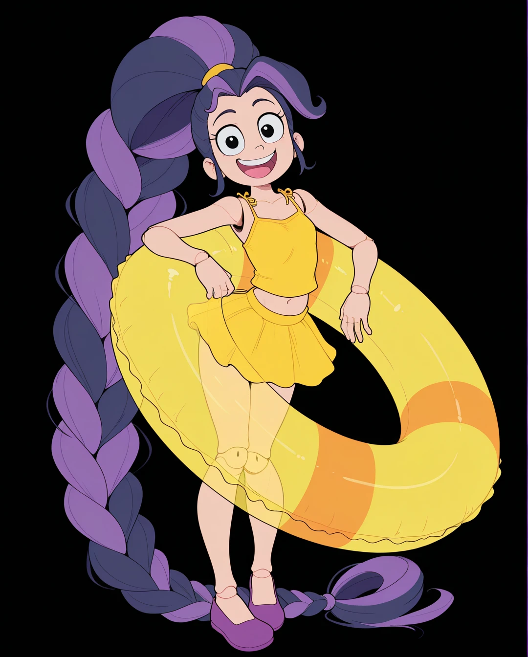 big hair, swim ring, innertube, shorts, purple footwear,