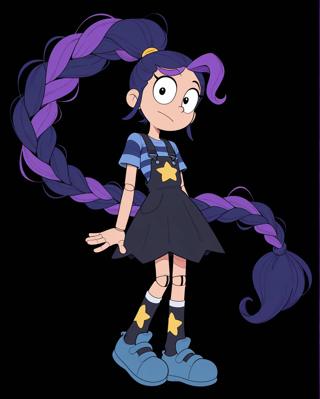 absurdly long hair, twintails, striped shirt, blue shirt, dress, star (symbol), socks, short sleeves, overalls, shoes, striped clothes,