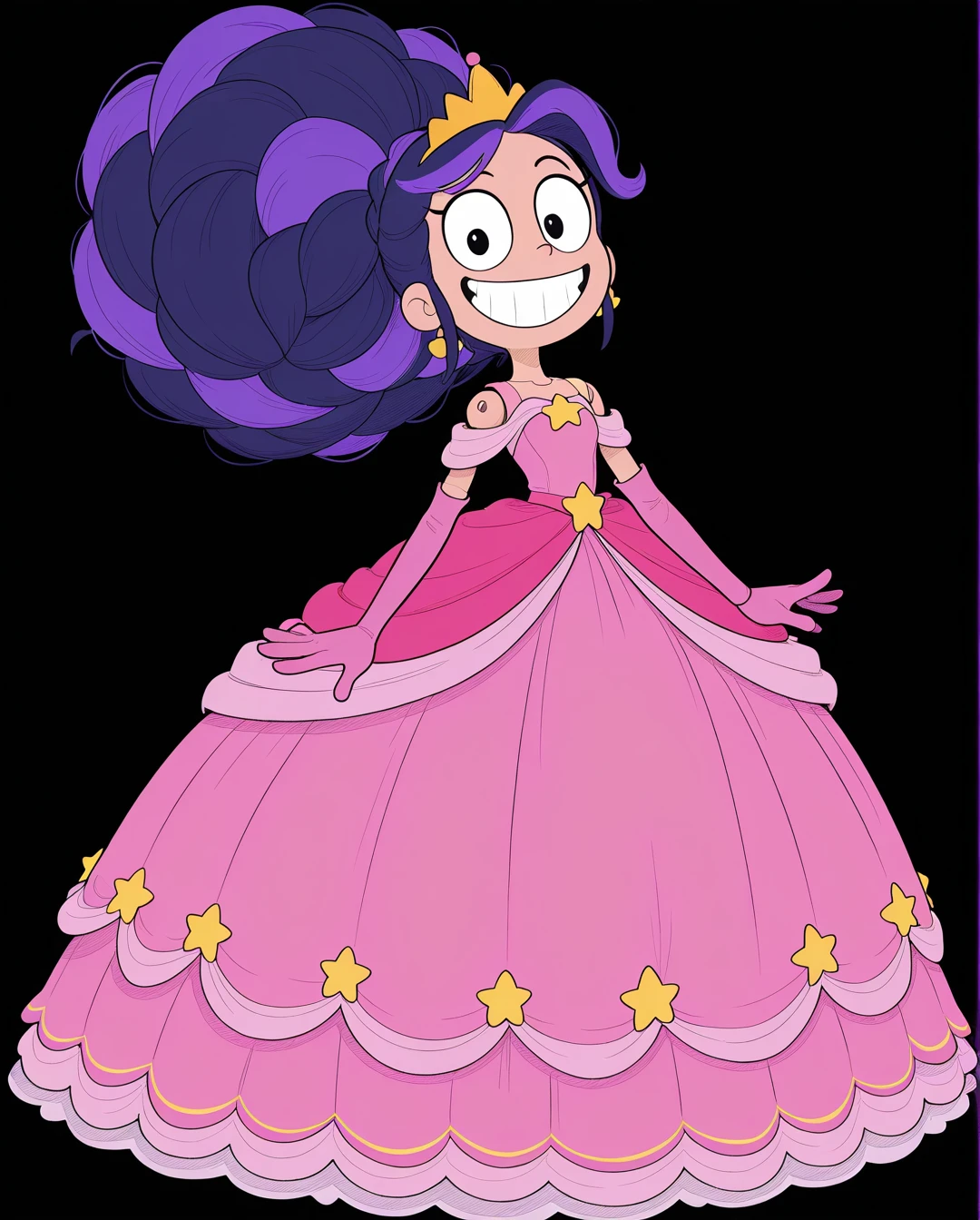 big hair, pink dress, pink gloves, jewelry, crown, earrings, elbow gloves, star (symbol), tiara, gown,