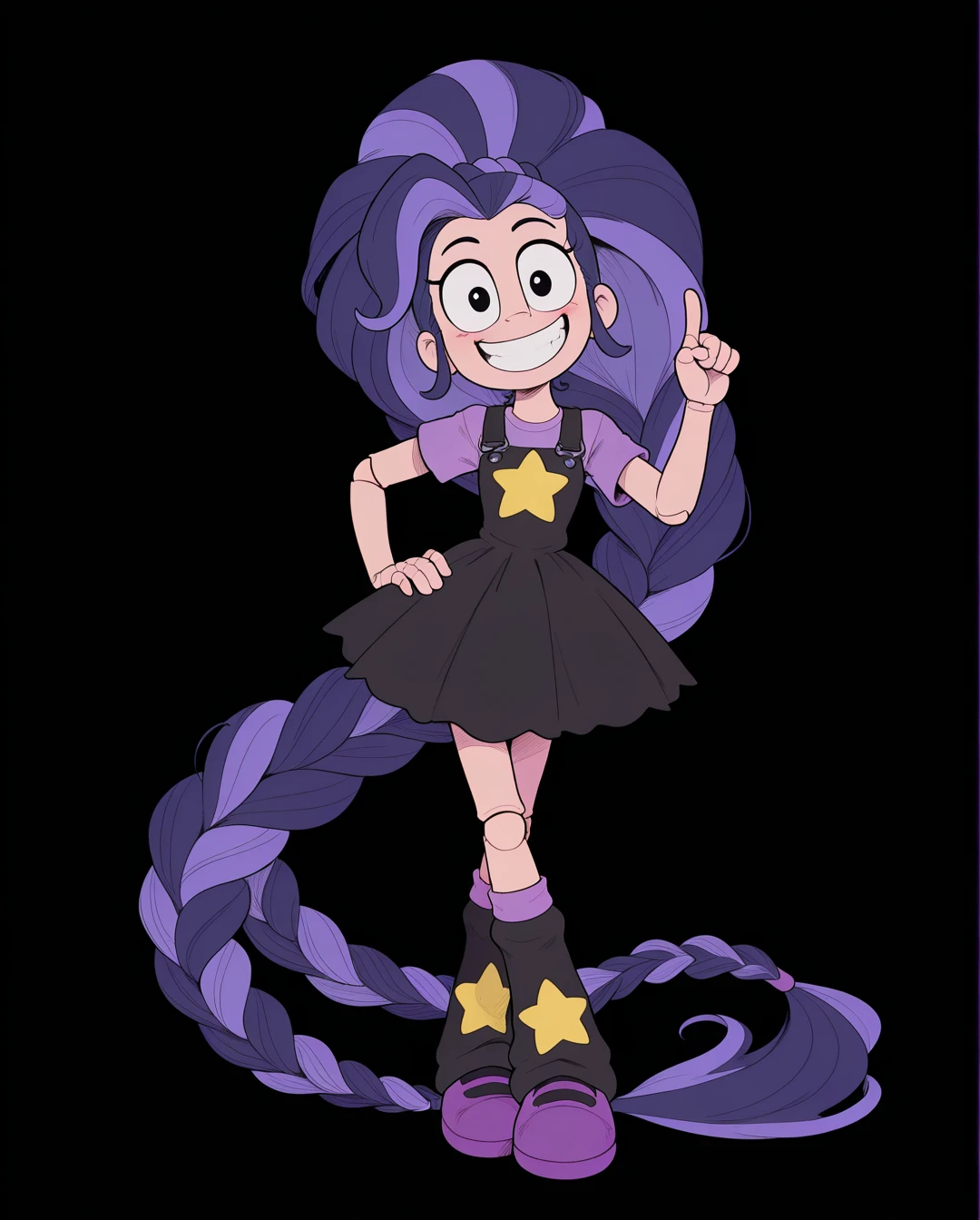 big hair, purple gloves, purple dress, blue gloves, star (symbol), socks, grin, yellow ribbon, blue dress,
