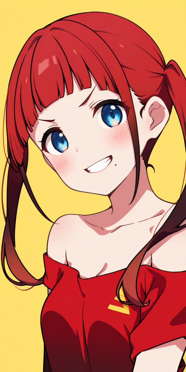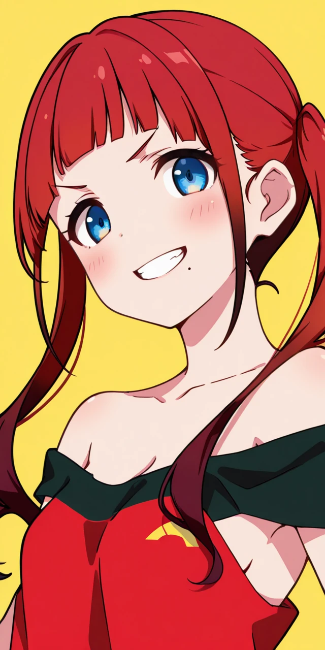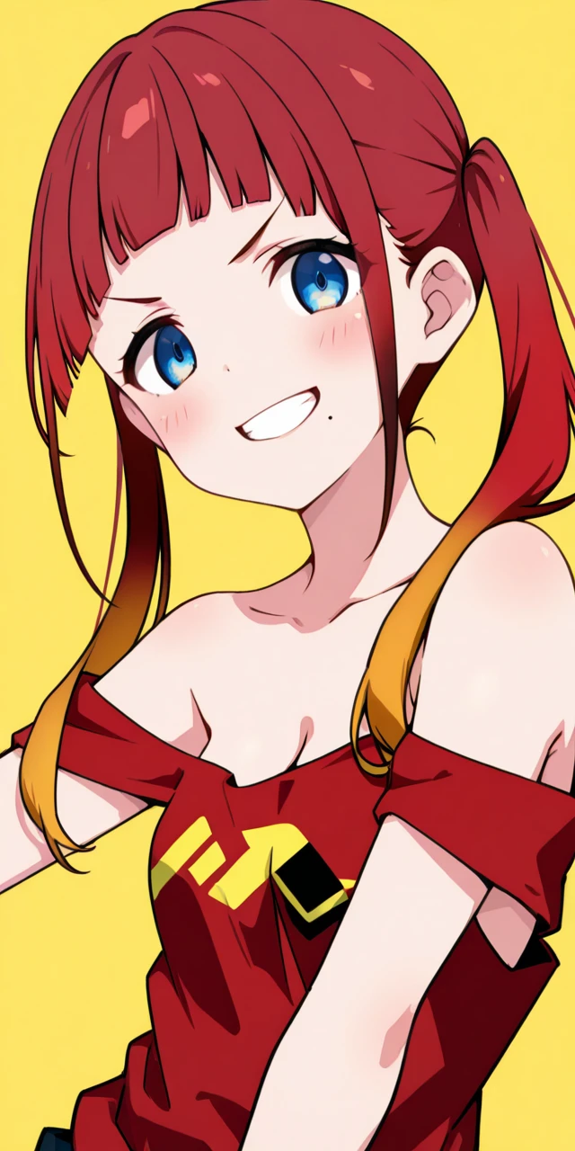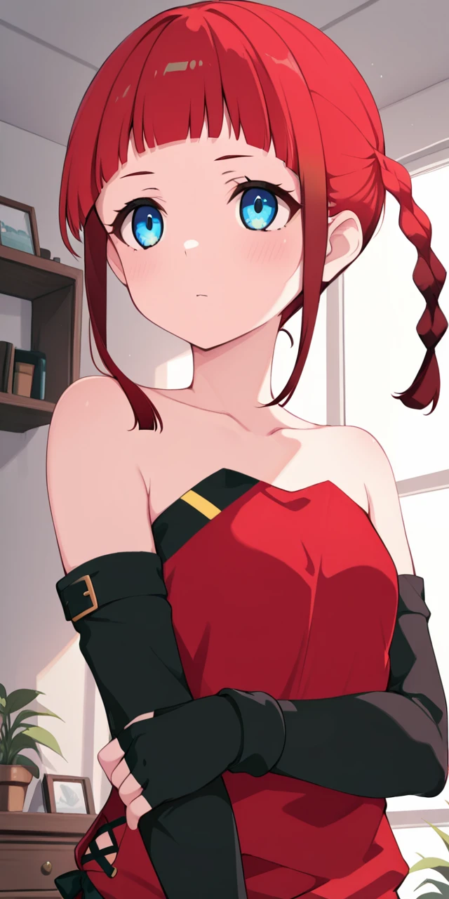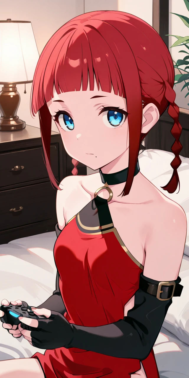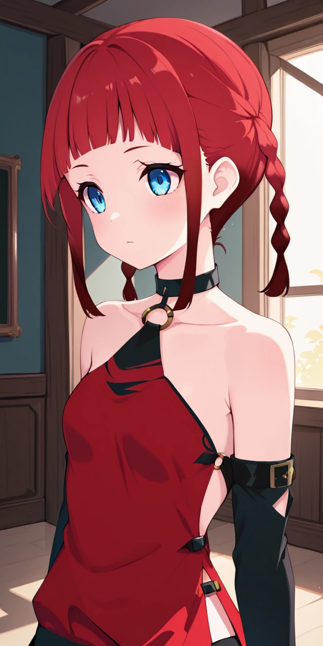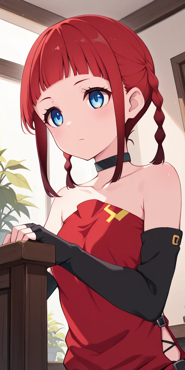ydchi, 1girl, bangs, blue eyes, bare shoulders, collarbone, braid, chocker, red dress, sidelocks, red hair, detached sleeves, small breasts, black gloves, elbow gloves, blunt bangs, fingerless gloves, twin braids, gradient hair, o-ring.