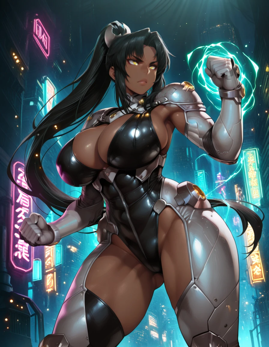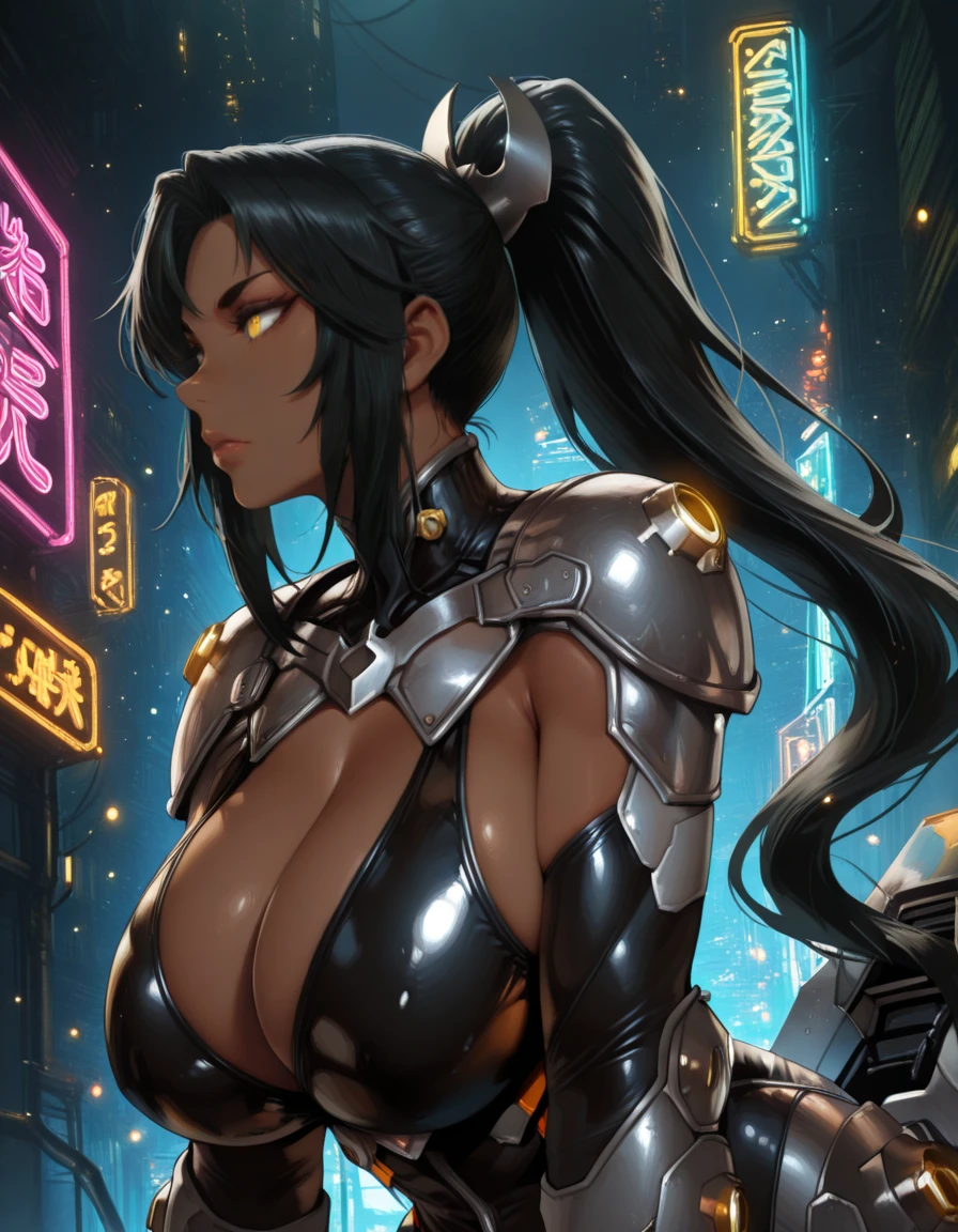 long hair, black hair, yellow eyes, dark skin,ponytail,
