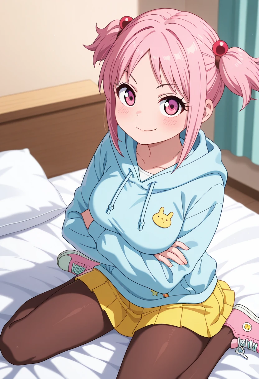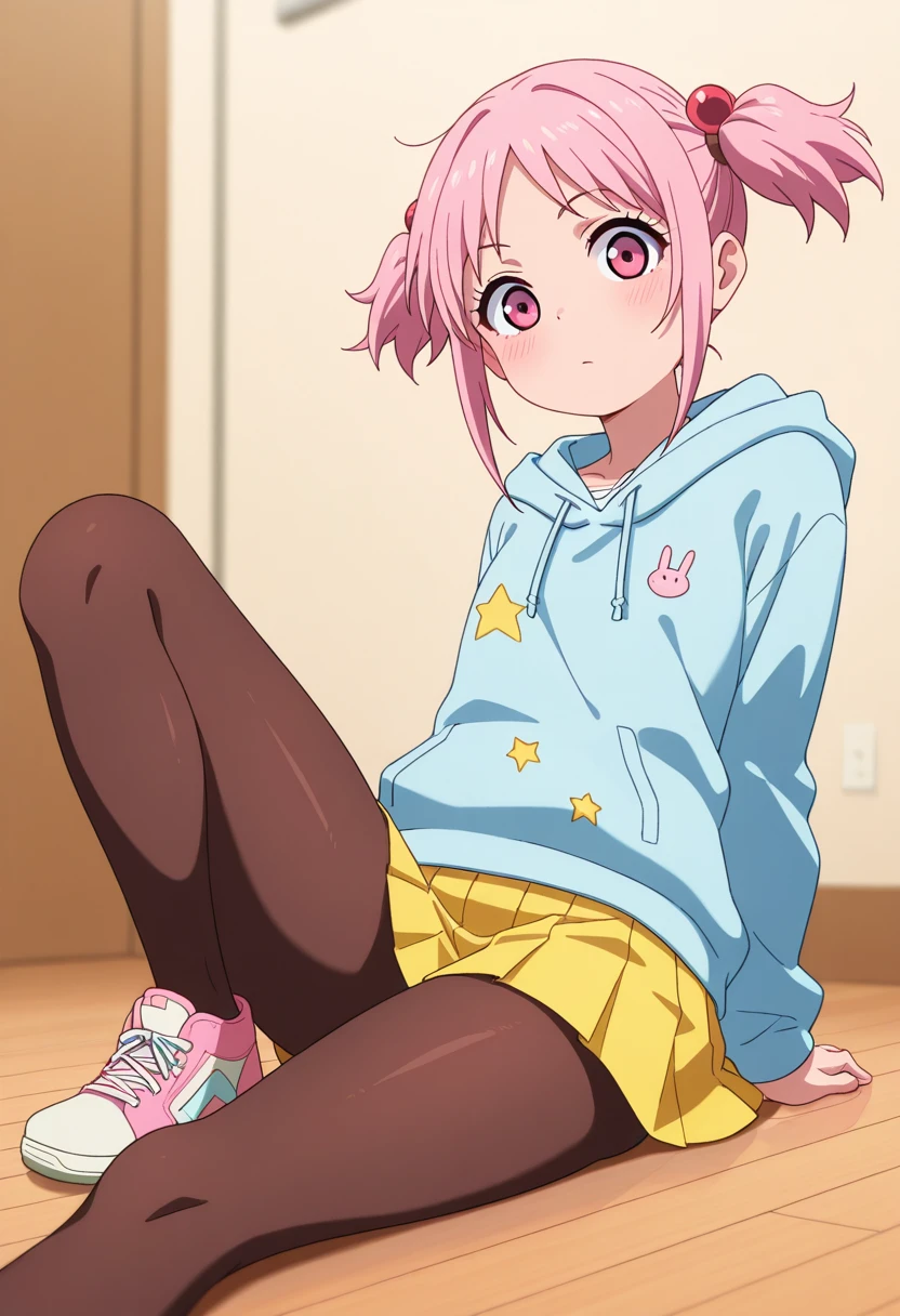 blue hoodie, hood, hood down, long sleeves, yellow pleated skirt, brown pantyhose, sneakers,