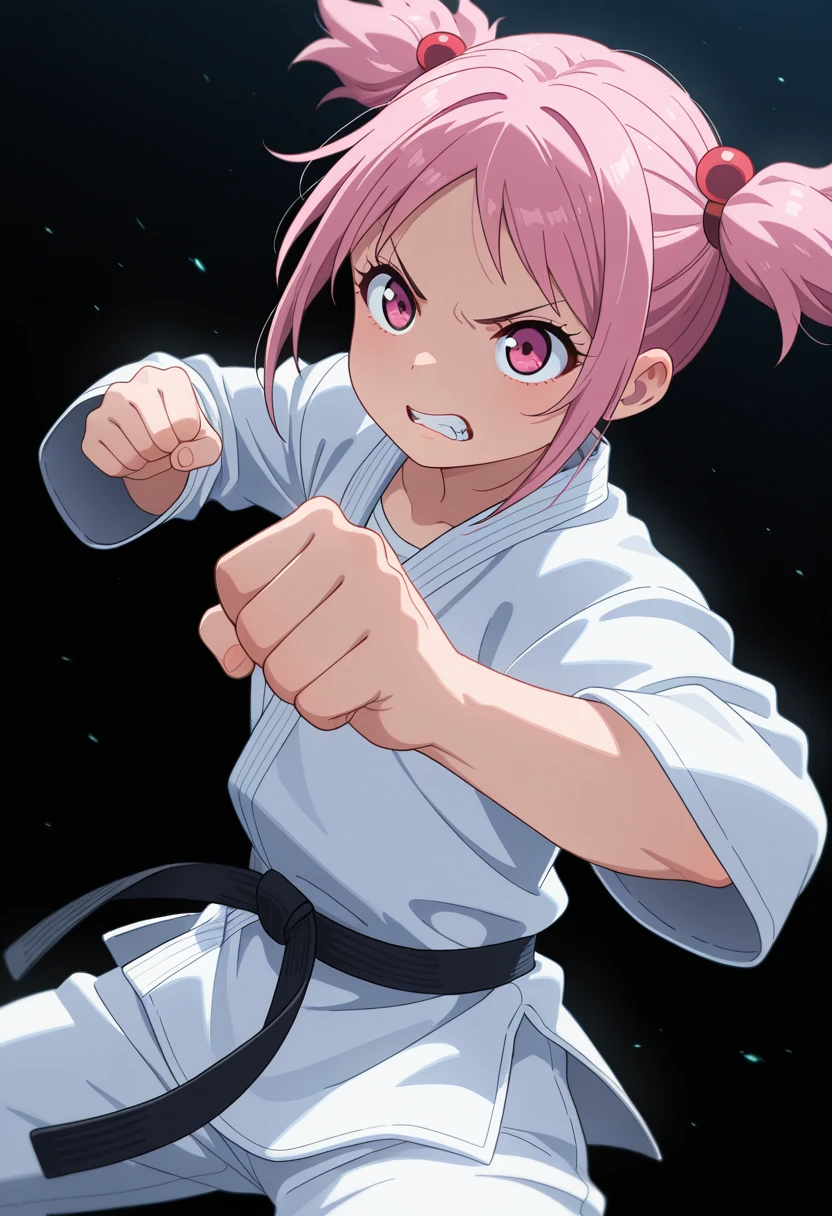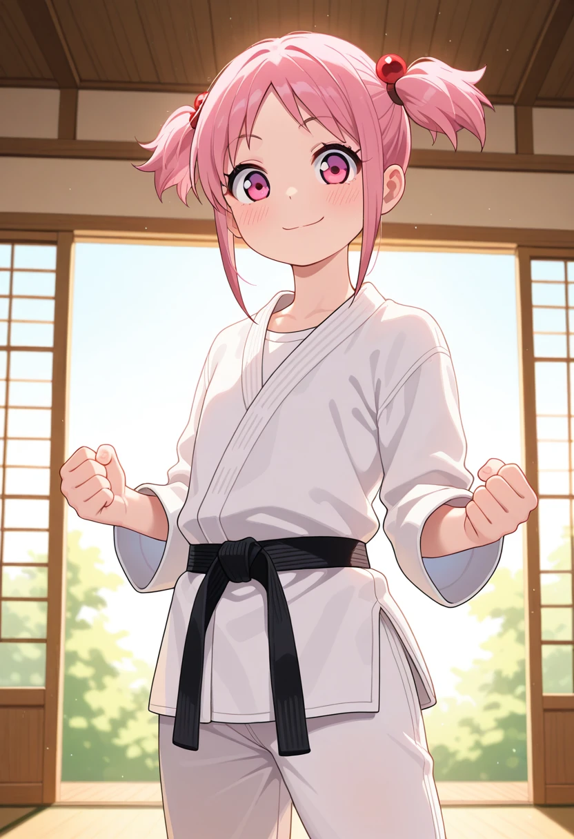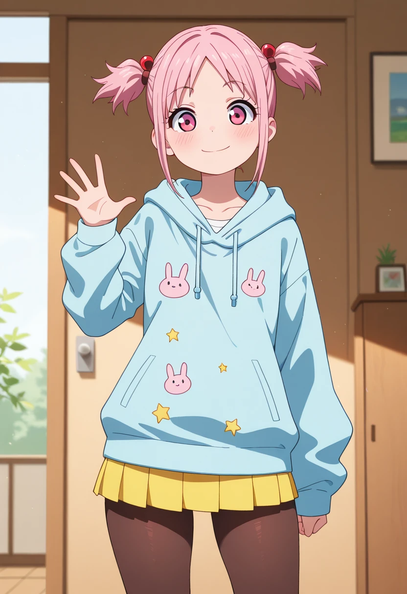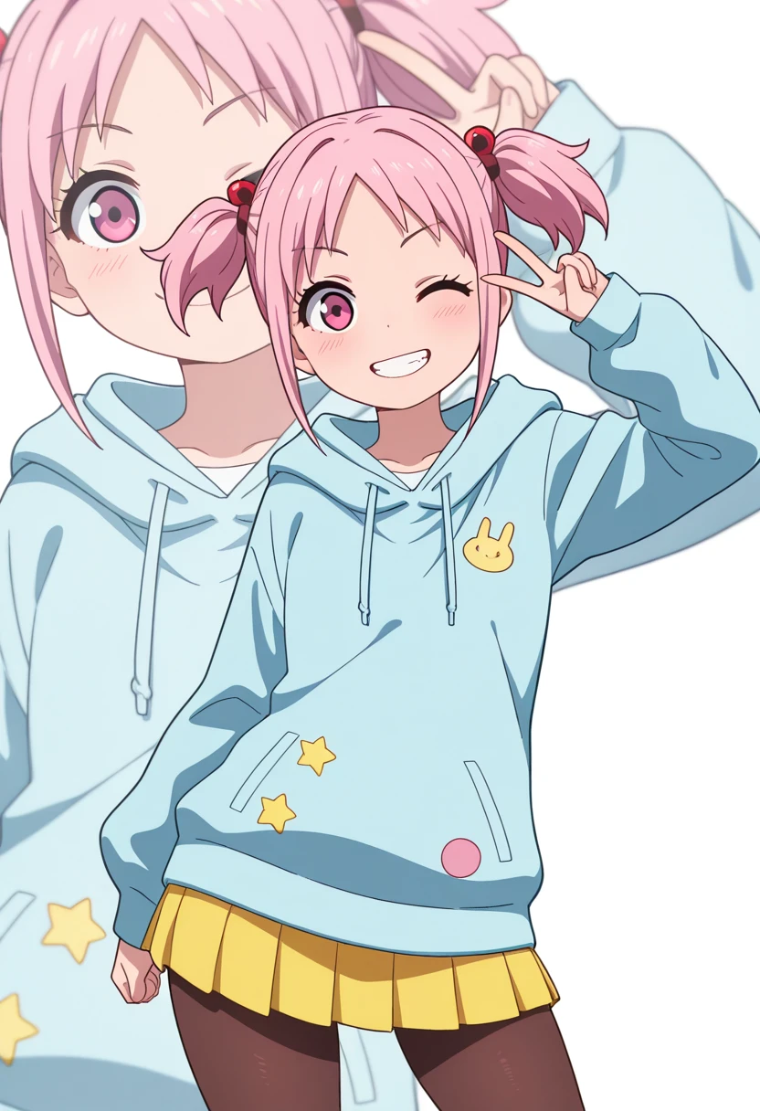 miu-yww, pink eyes, pink hair, short hair, short twintails, hair bobbles,