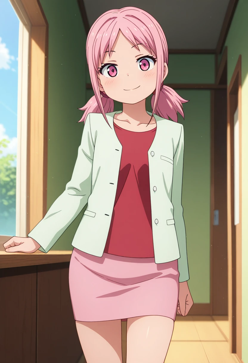 light green jacket, red shirt, long sleeves, pink pencil skirt, pink footwear,