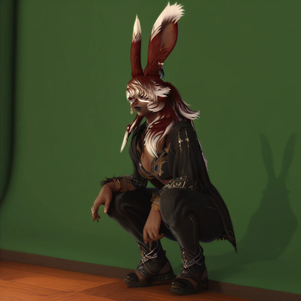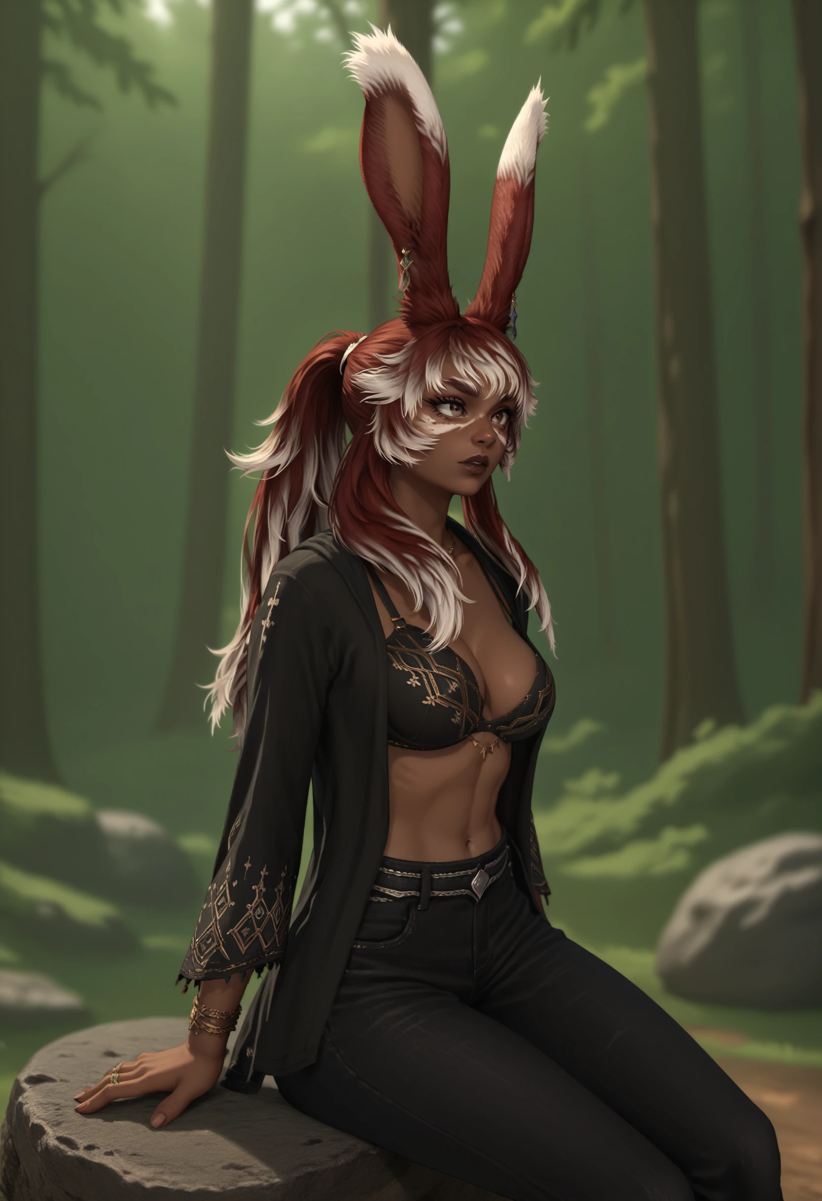 Mantebrume, Viera, brown skin, red hair with white highlights, bunny ears, white facial marking, grey eyes, dark lips, big breast, open black shirt, bra, black denim pants, jewelry,