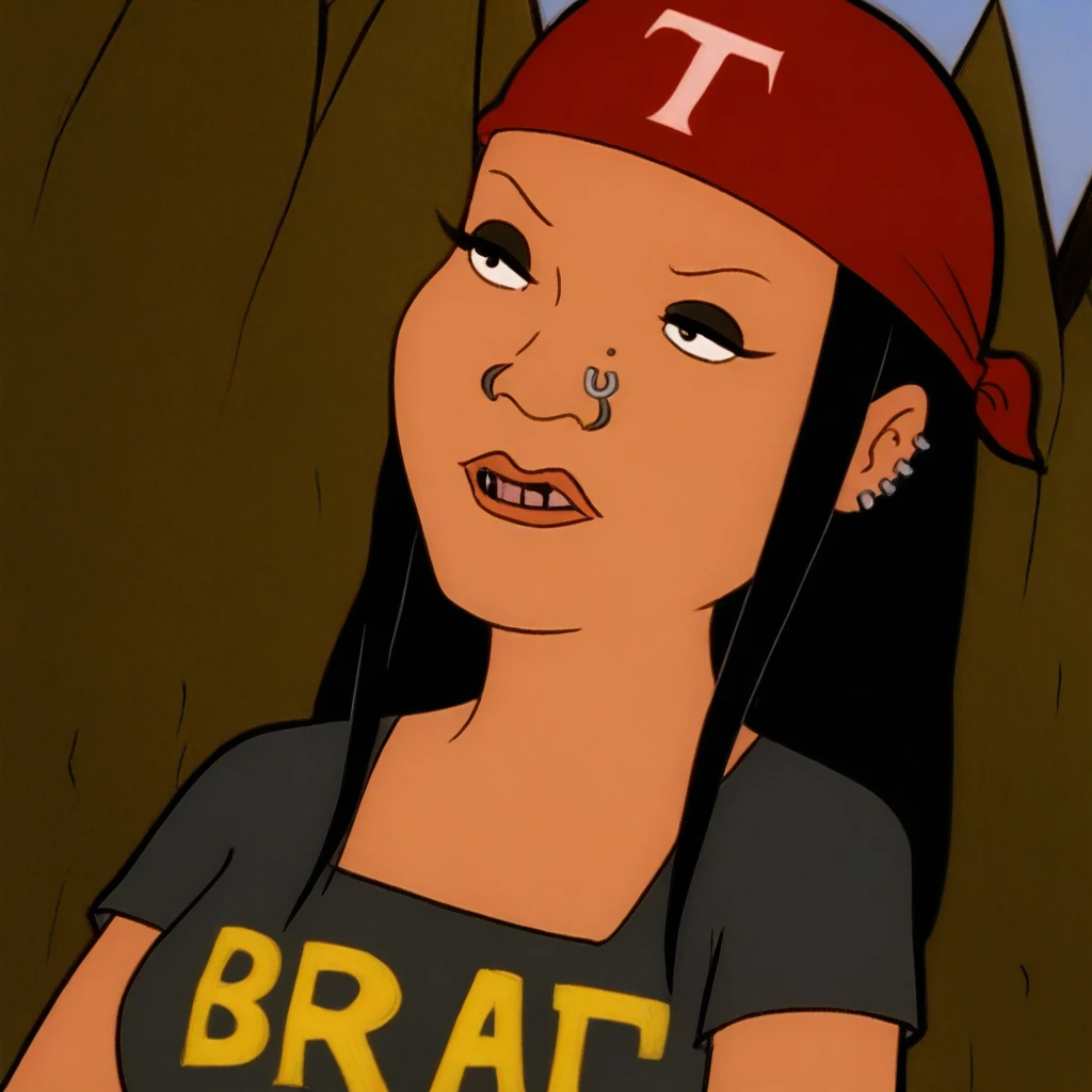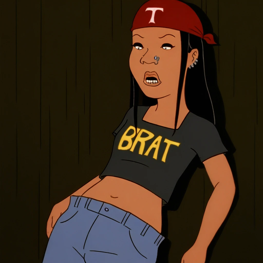 Tid,black hair,1girl,brown hair , bandana,crop top,jeans,midriff,nose piercing,ear piercing