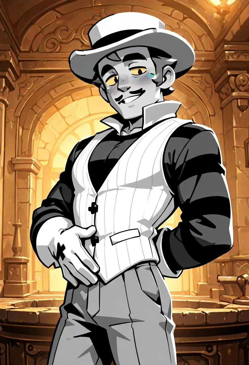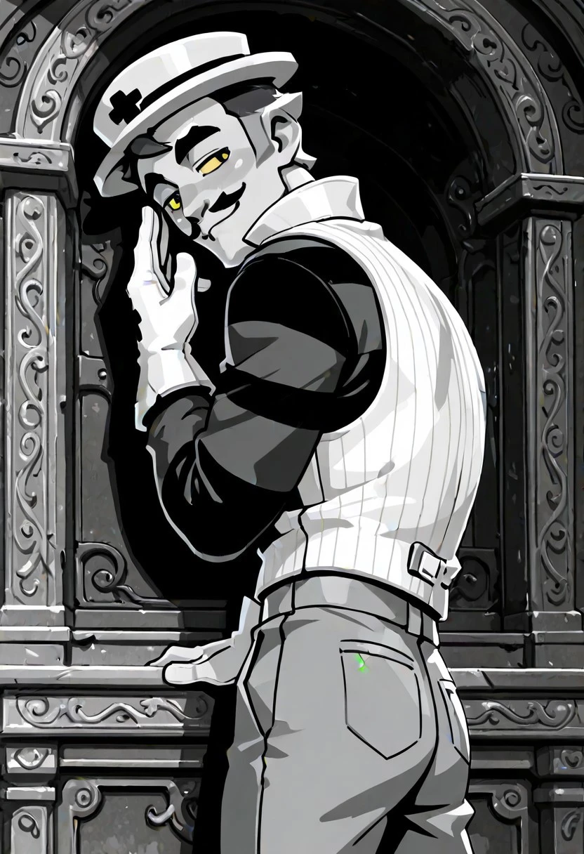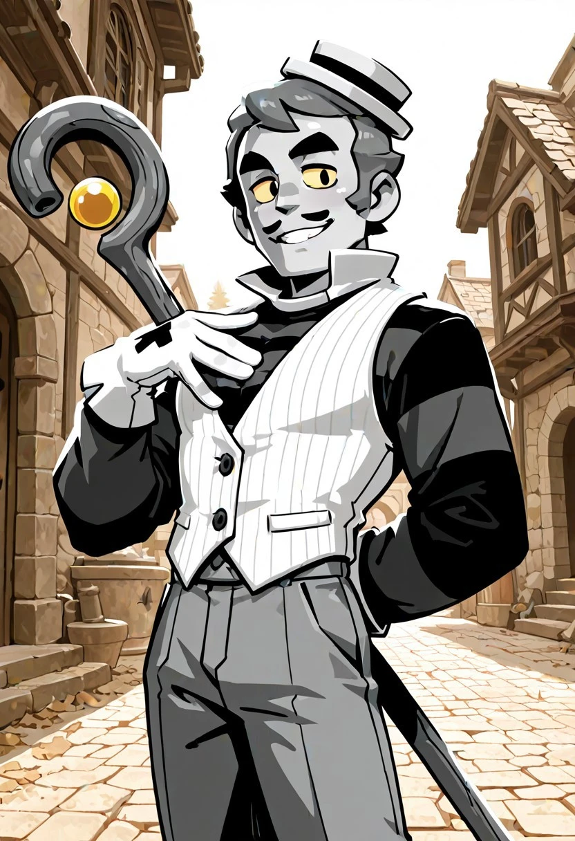 Gray Brawl Stars, gray skin, mustache, mustache, black long-sleeved shirt with stripes, white vest with collar, thin, muscular, gray pants with sewing patches, white gloves, yellow eyes, small hat