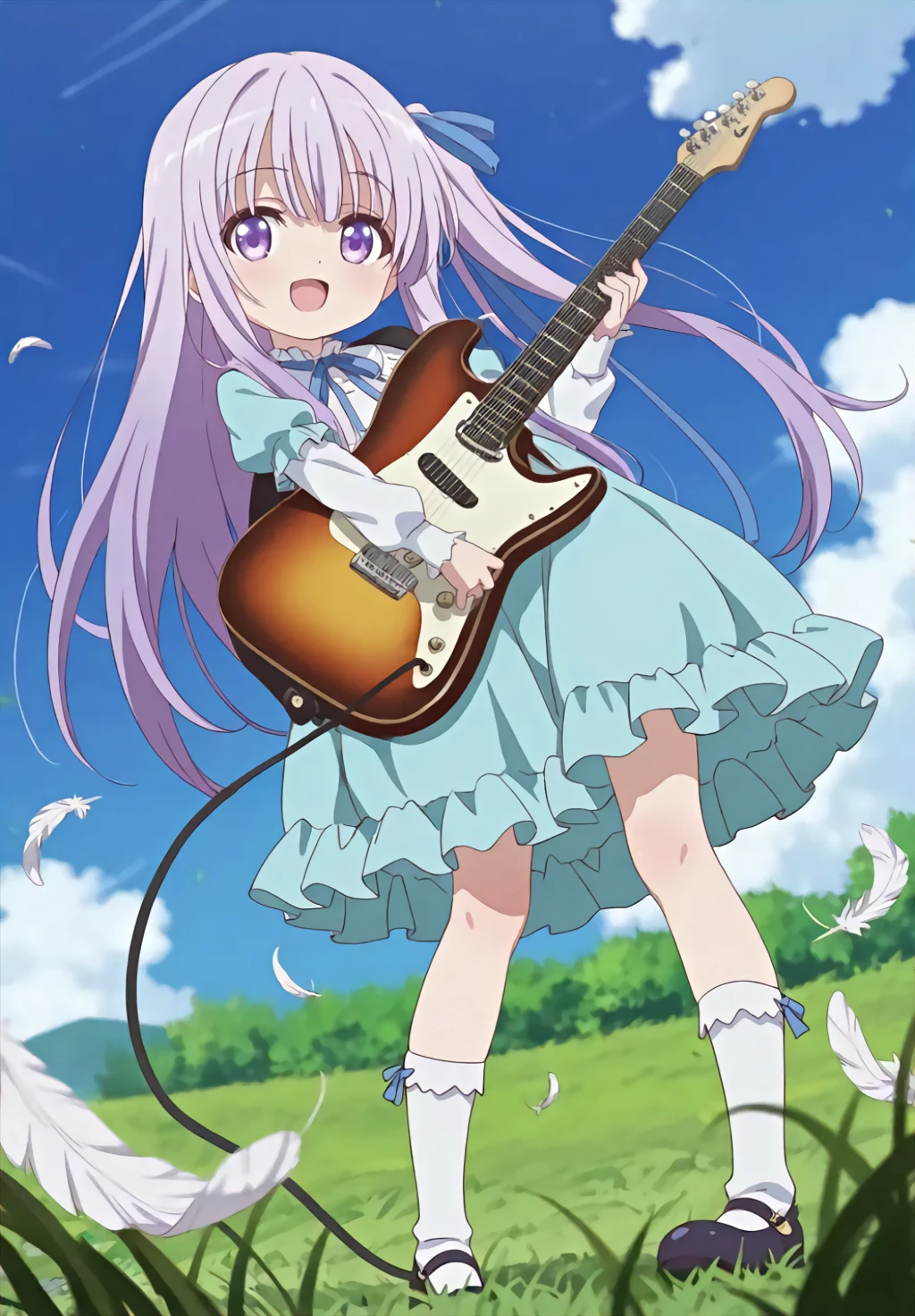 ギターを持たせる場合はholding guiter,electric guitar等のプロンプトを使用してください。
