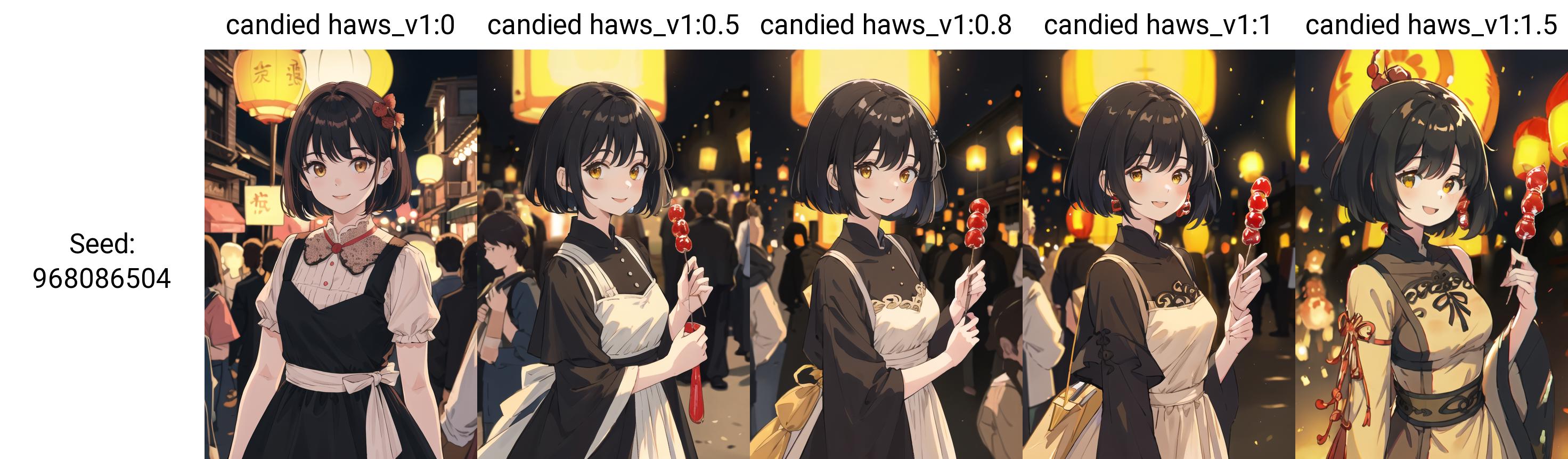 我训练强度并不高,所以权重一般 1 是可以的,但部分情况可能糖葫芦会溢出,根据不同模型,在 0.5~1 之间自行调整吧。