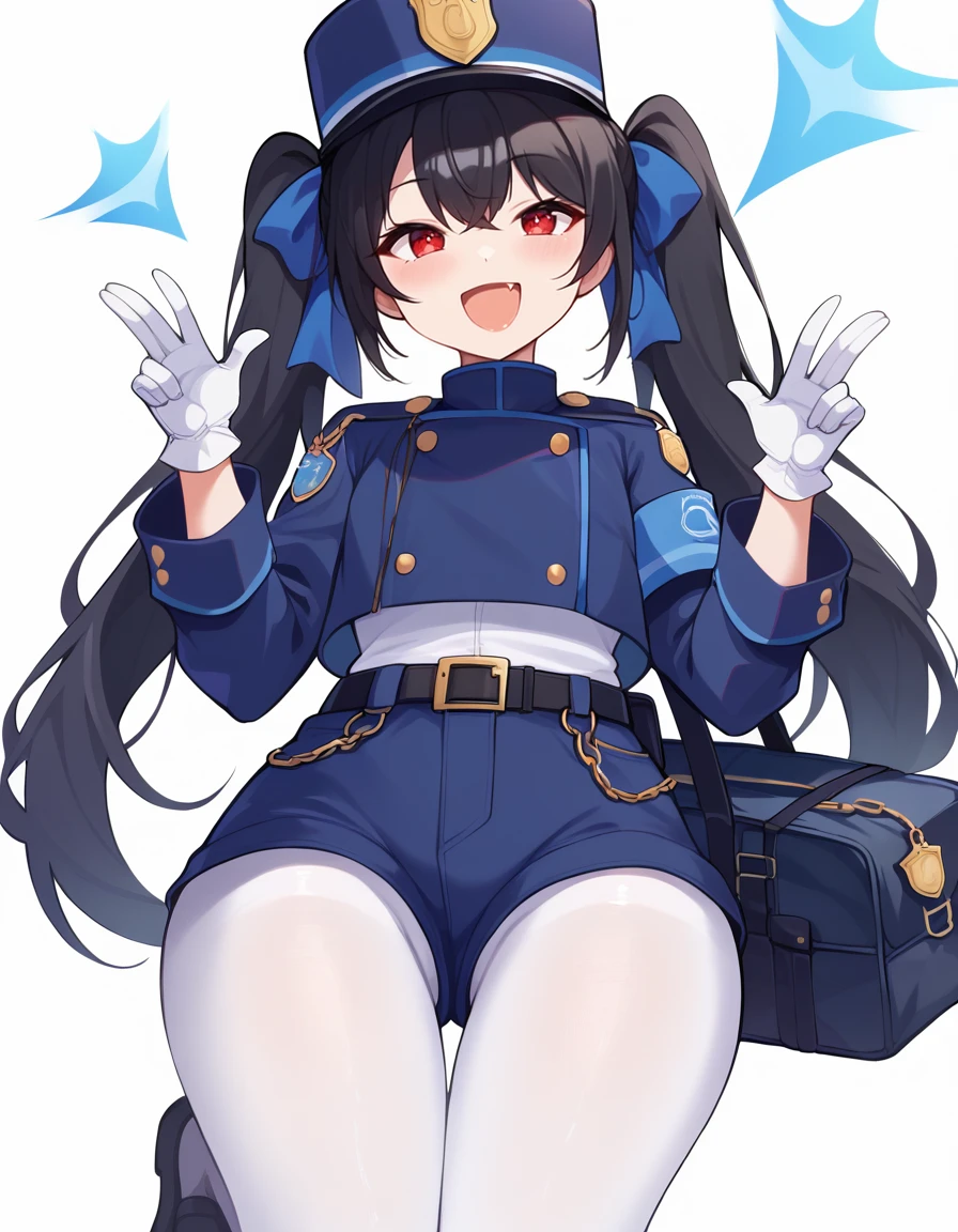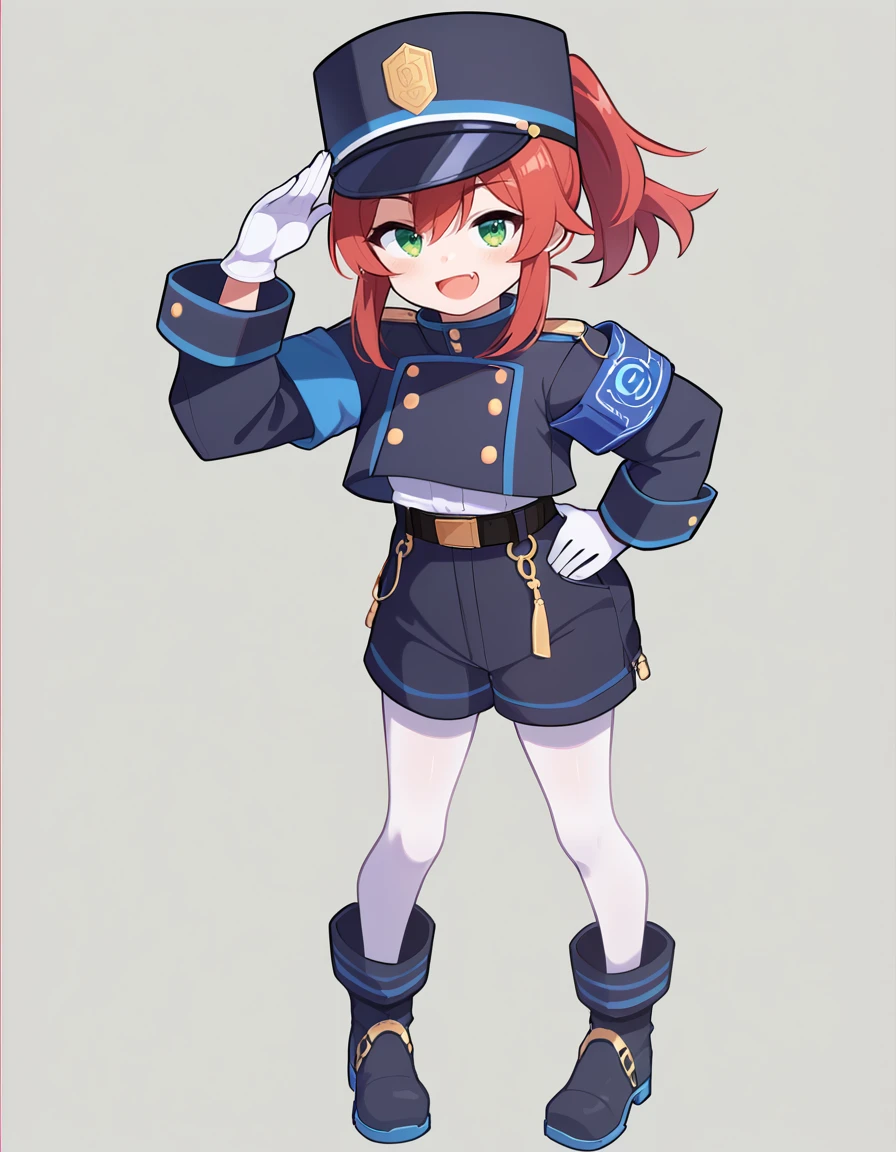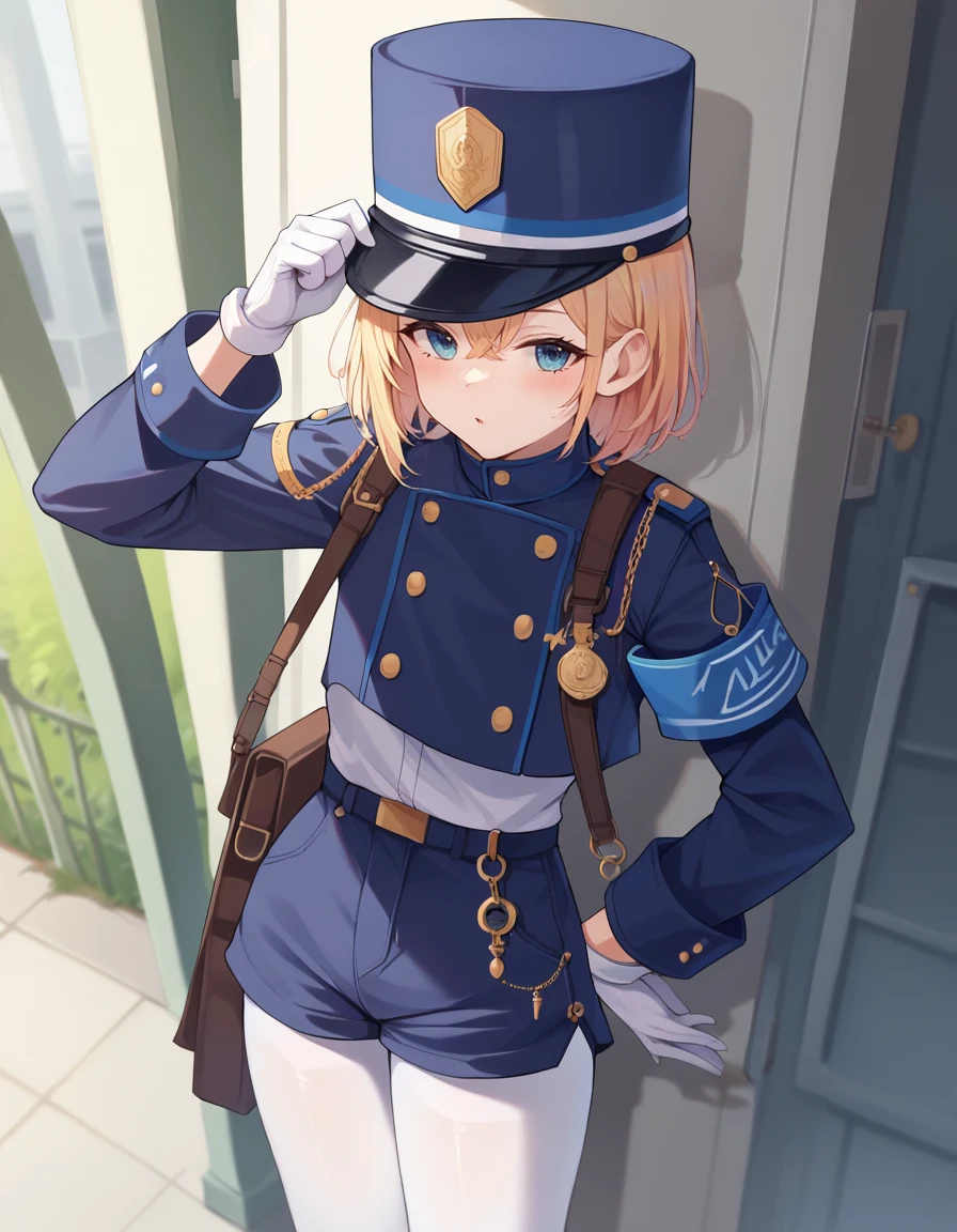 "nozocloth, gloves, white gloves, hat, white pantyhose, uniform, blue headwear, blue shorts,armband, jacket, long sleeves, blue jacket"