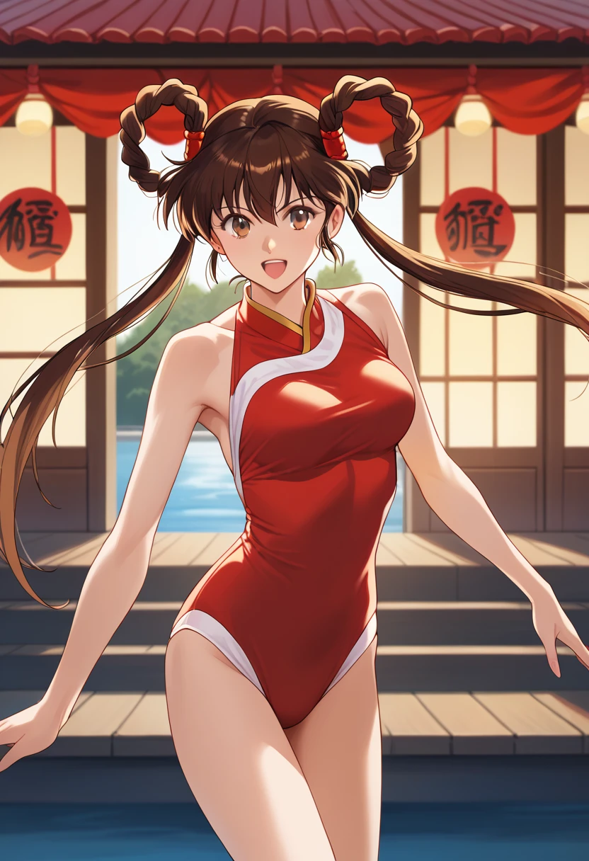 dyohko, long hair, brown hair, hair rings, chinese clothes, red dress, sleeveless