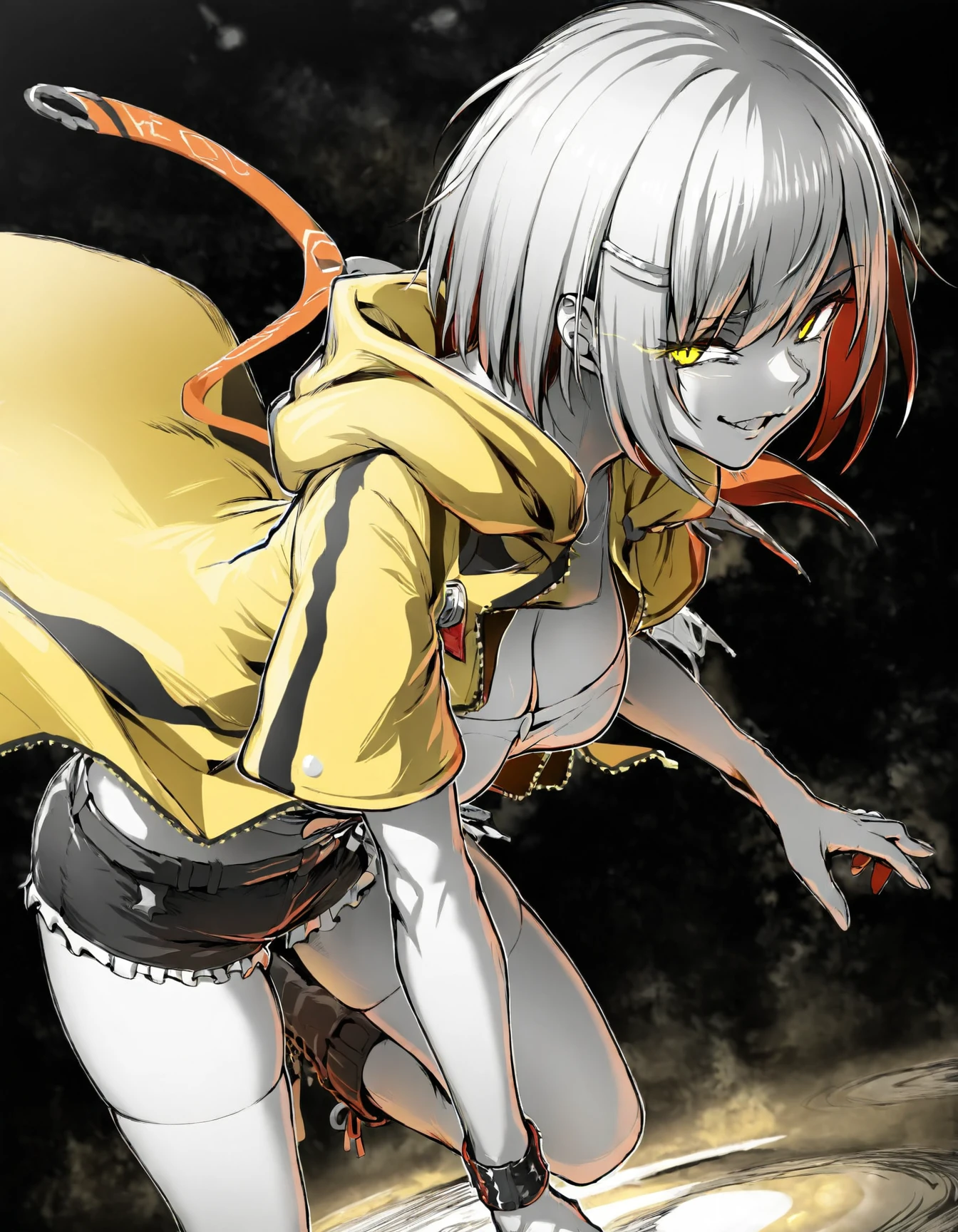 ebiblue, monochrome, greyscale, gesugao, black background, glowing eyes, colored eyes, shaded face
