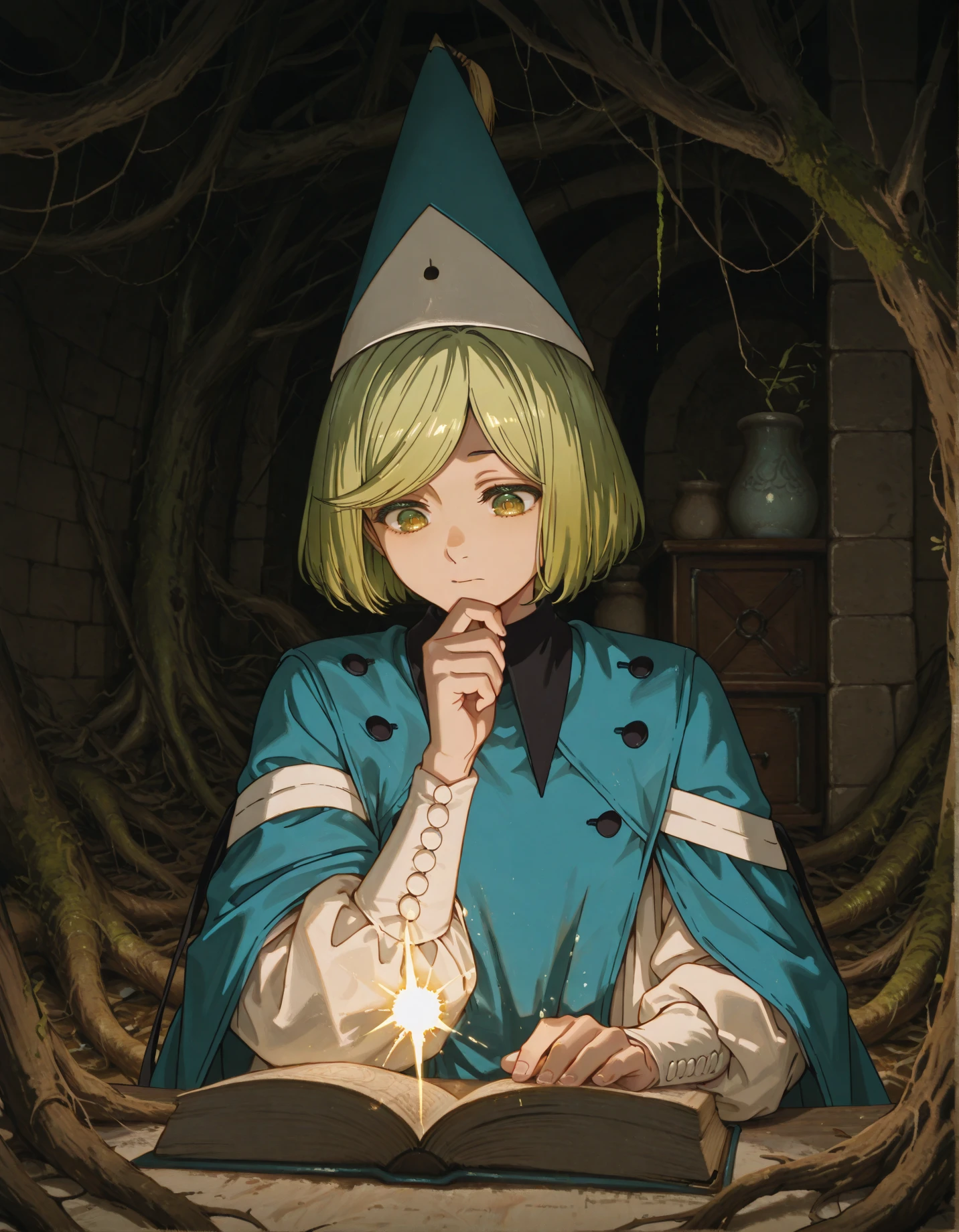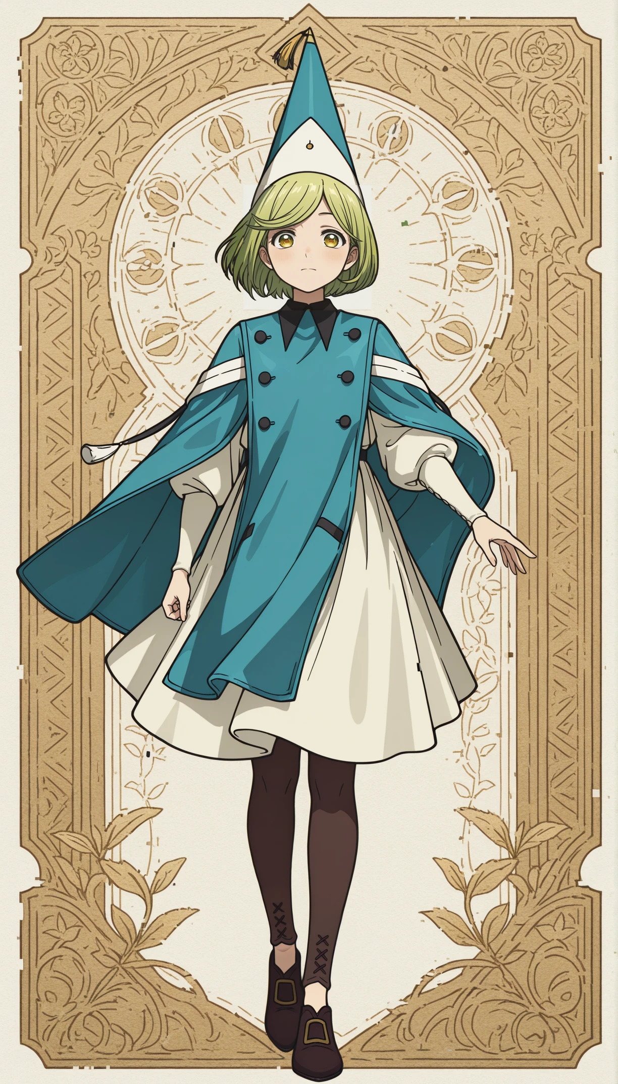 coco, 1girl, green eyes, gradient eyes, green hair, blue robe, tabard, wizard hat, tassel, white dress, brown pantyhose🎨 PROFIT 2