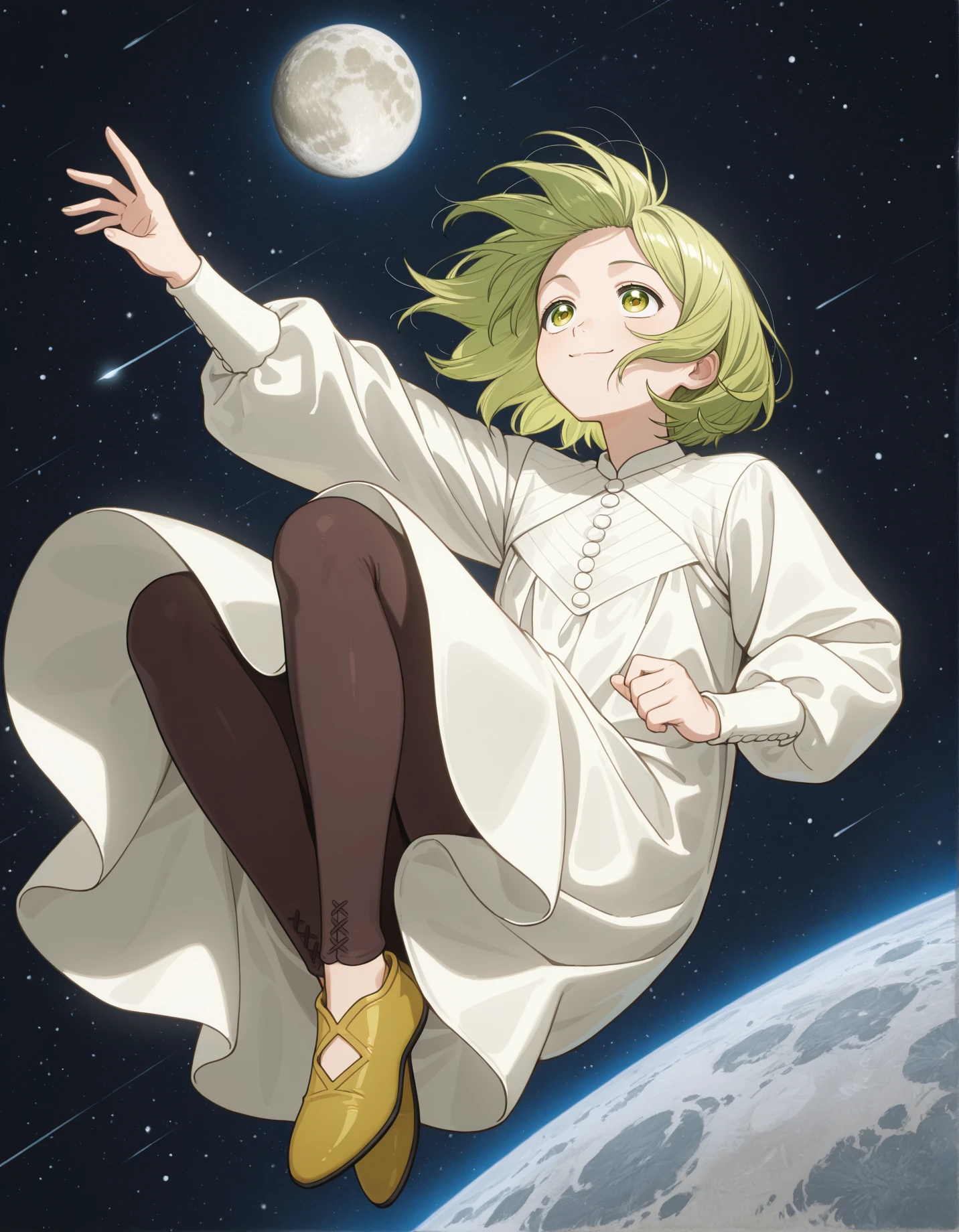coco, 1girl, white dress,loose fit,short hair, green eyes, gradient eyes, green hair, brown pantyhose🎲 Optional prompts