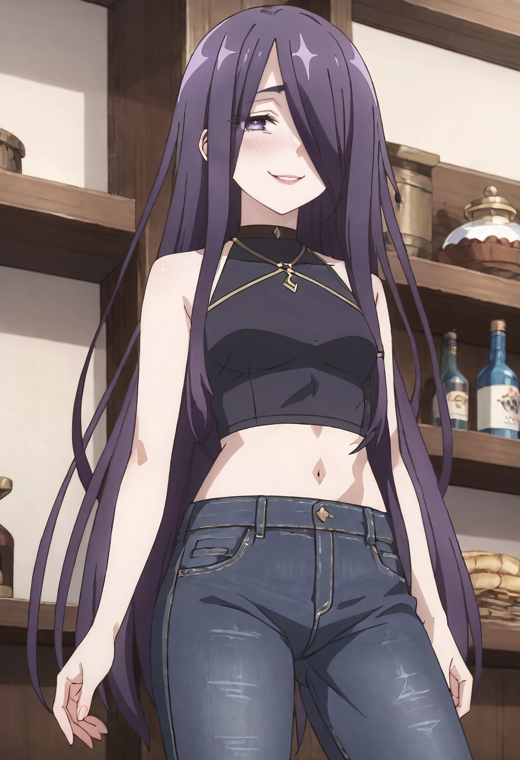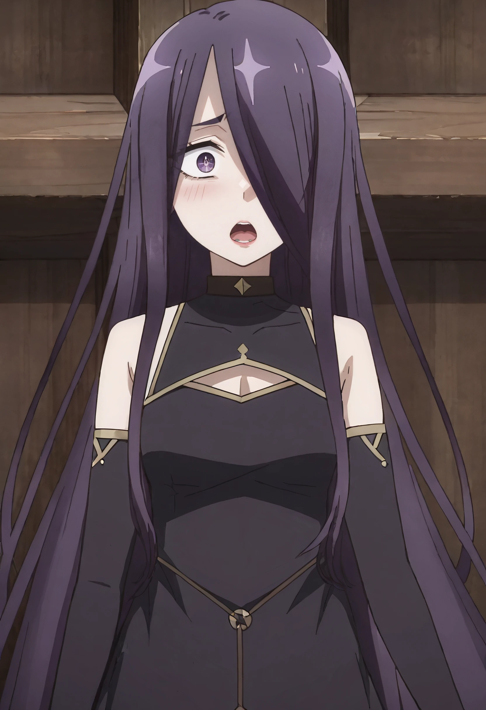 JHNInnkeeper, long hair, purple hair, hair over one eye, very long hair, purple eyes,