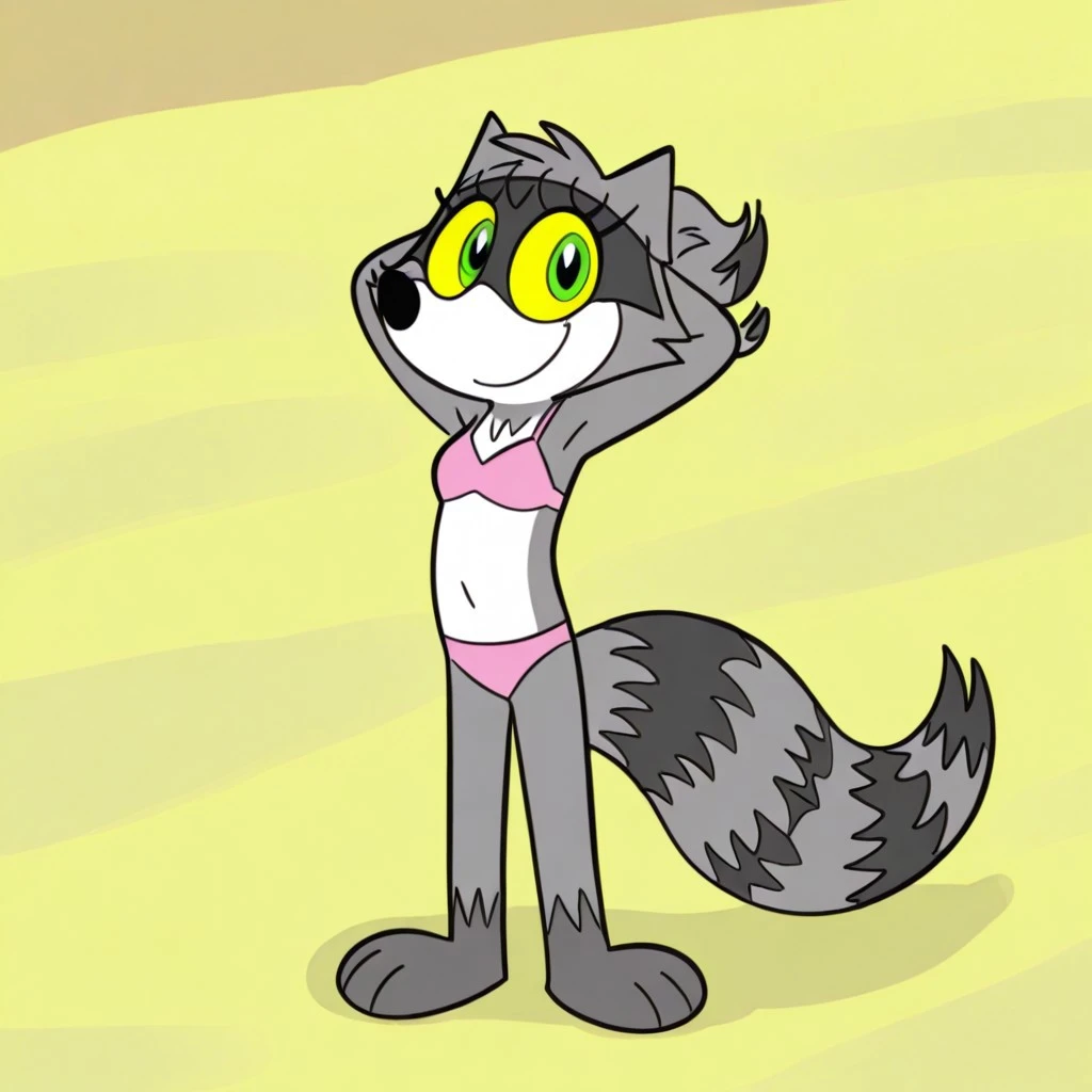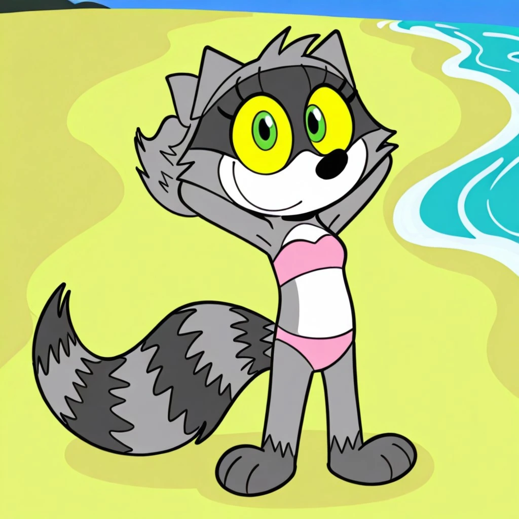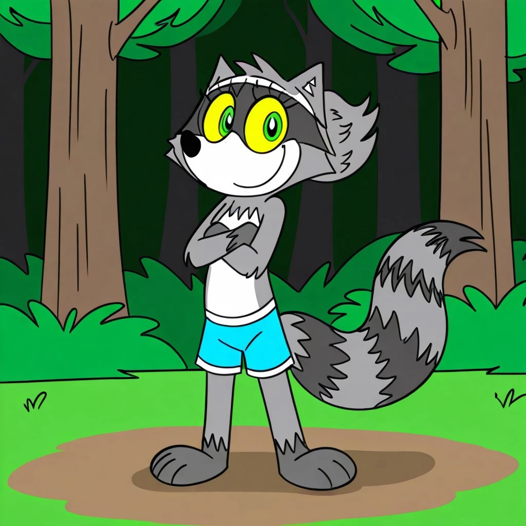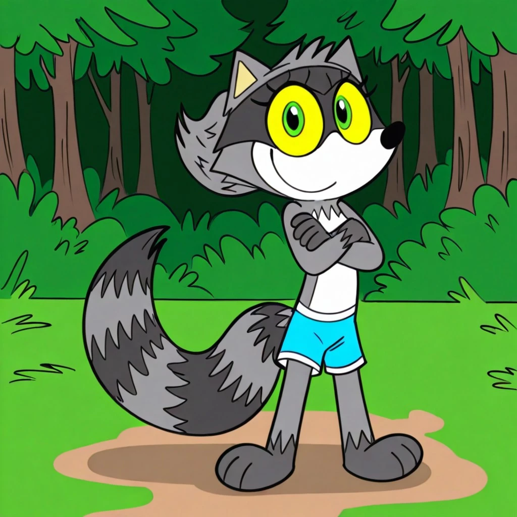 raccoon, raccoon girl, gray and black fur, green eyes, yellow sclera, black nose, raccoon ears, raccoon tail, blue shorts,