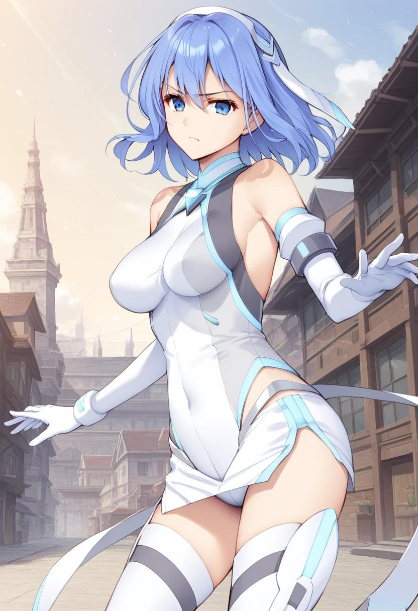 magical girl: kirika,magical girl,blue hair,hair between eyes,medium breasts,headgear,white elbow gloves,white thighhighs,mature female,leotard,medium hair,skirt,