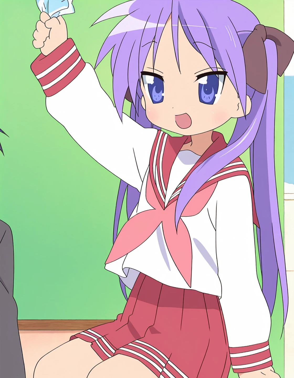 kagami_hiiragi, lucky star, purple hair, long hair, twin tails, brown ribbons, purple eyes, anime screencap,