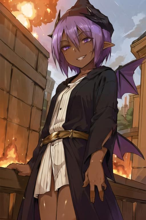 Recommended tags - brown hair, short hair, purple eyes, / purple hair, dark skin, bat wings, low wings,
