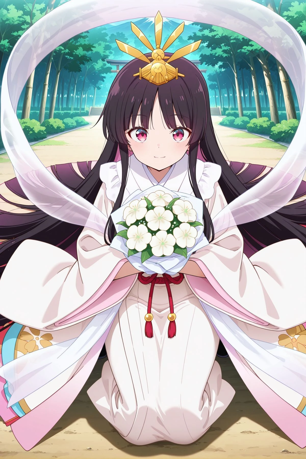 houraisan kaguya, 1girl, solo, red eyes, black hair, long hair,white bowtie, frilled collar, pink shirt, long sleeves, wide sleeves, red skirt, long skirt, frilled skirt, Optional :