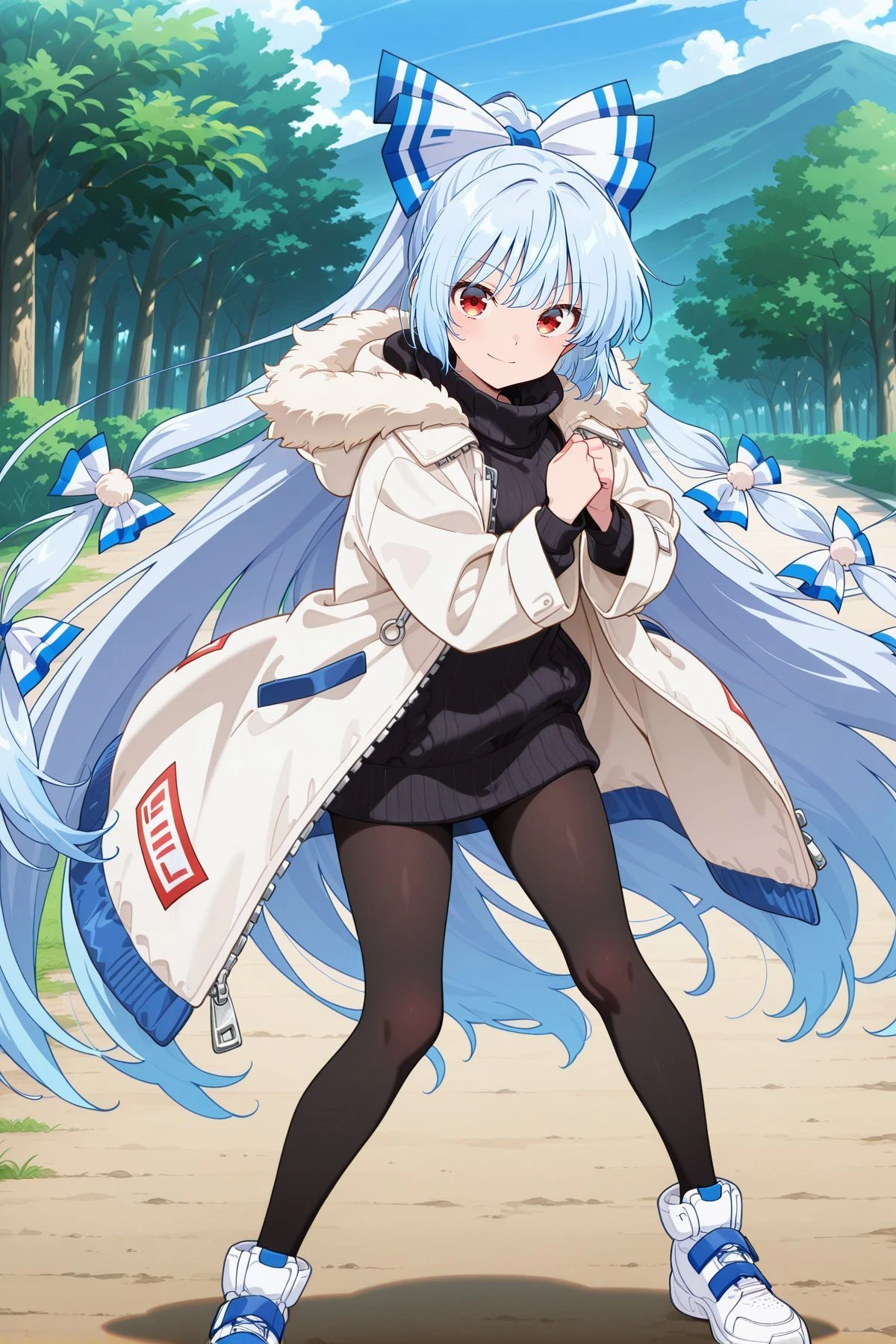 fujiwara no mokou, 1girl, solo, red eyes, light blue hair, very long hair, fujiwara no mokou \(hourai heat pump\), alternate hair color, alternate costume, single hair bow, blue bow, pom pom hair ornament, hood down, white coat, fur-trimmed coat, long sleeves, ofuda on coat, open coat, zipper, turtleneck, black sweater, black pantyhose, white sneakers,Fujiwara no Mokou (Hourai Engine Owner) :
