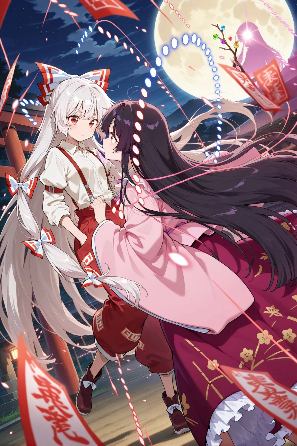 houraisan kaguya, 1girl, solo, purple eyes, brown hair, long hair,, houraisan kaguya \(brilliant sheltered beauty\), alternate costume, purple hat, beret, hat ornament, red bowtie, pink jacket, open jacket, long sleeves, frilled sleeves, wide sleeves, black shirt, red skirt, plaid skirt, frilled skirt, black socks, kneehighs, brown shoes,houraisan kaguya, 1girl, solo, purple eyes, black hair, very long hair, hime cut, blunt bangs, sidelocks,, houraisan kaguya \(moonlit festival!\), alternate costume, green bowtie, white shawl, hagoromo, pink shirt, long sleeves, wide sleeves, red skirt, long skirt, leaf print skirt, frilled skirt, holding bow \(weapon\),houraisan kaguya, 1girl, solo, pink eyes, brown hair, absurdly long hair,, houraisan kaguya \(white shining bamboo in the night\), alternate costume, hair ornament, gold kanmuri crown, kanzashi, white kimono, print kimono, layered kimono, karaginu mo, hagoromo, white shawl, see-through shawl, long sleeves, wide sleeves, holding bouquet, iron ring, oversized ring,houraisan kaguya, 1girl, solo, brown eyes, brown hair, long hair,, houraisan kaguya \(hourai ornament\), alternate costume, pink hairband, vertical-striped hairband, red bow, pink neck ribbon, pink dress, negligee, long sleeves, wide sleeves, horizontal-striped socks, pink socks, kneehighs, holding stuffed rabbit,houraisan kaguya, 1girl, solo, brown eyes, black hair, long hair, sidelocks,, houraisan kaguya \(love temple of benevolence and conscience\), alternate costume, space helmet, pink helmet, white cape, gold trims, two-tone spacesuit, pink spacesuit, long sleeves, white gloves, black belt, crescent pin, pink boots, holding gun,Fujiwara no Mokou :