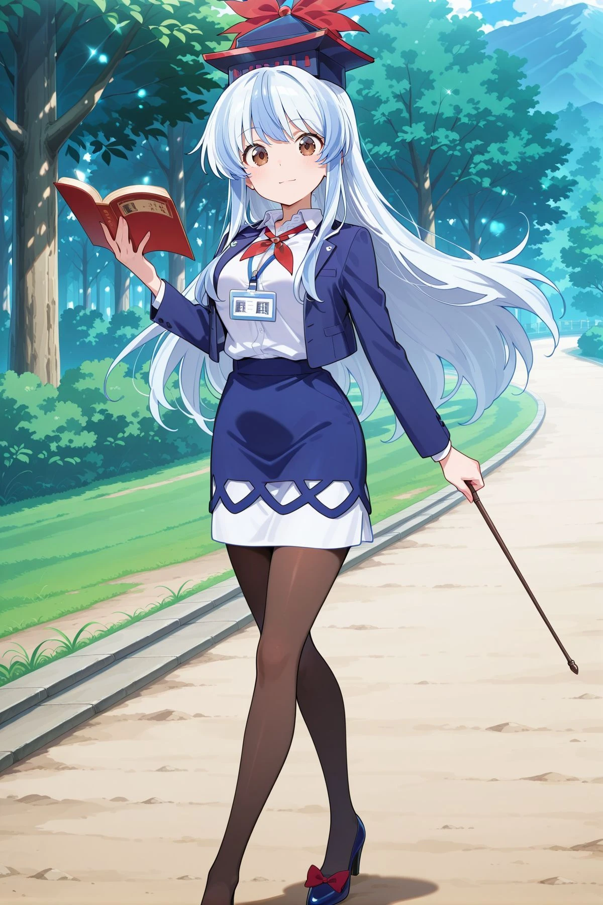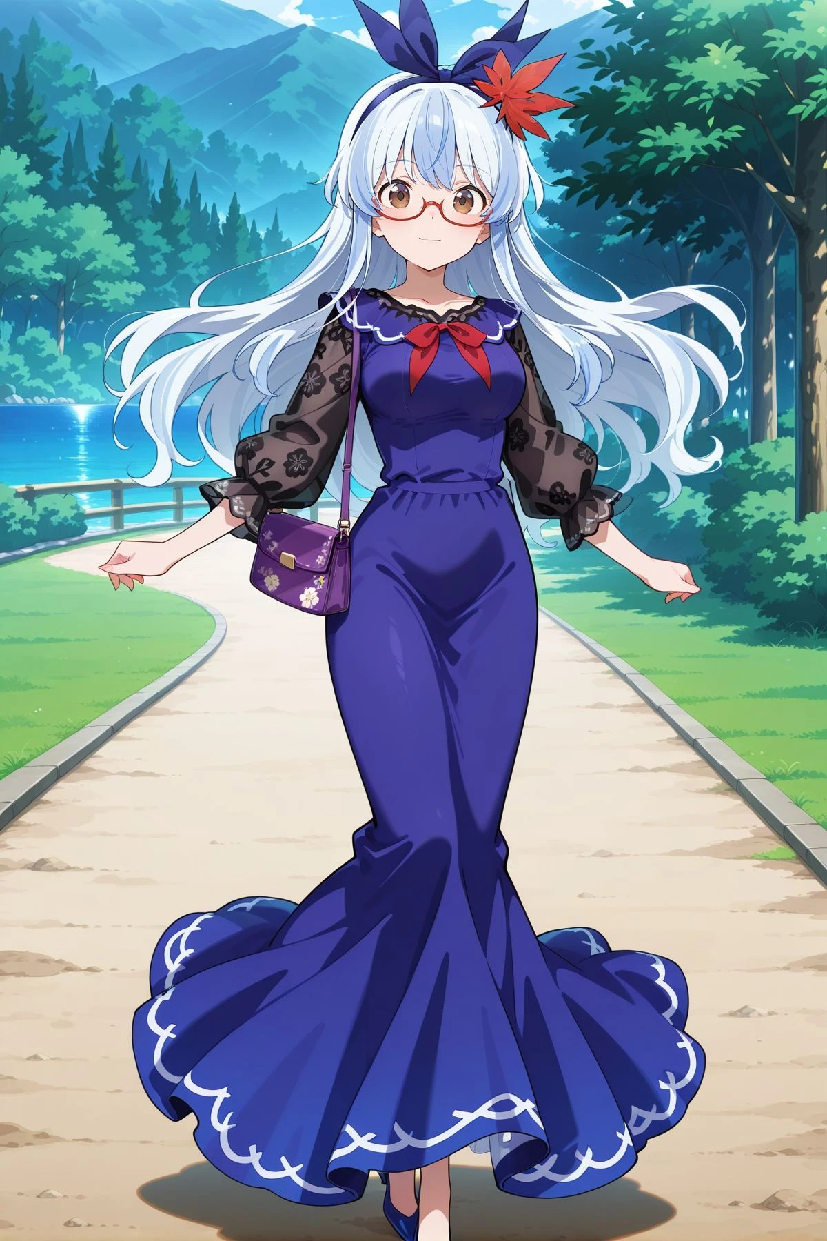 kamishirasawa keine, 1girl, solo, brown eyes, two-tone hair, blue hair, white hair, long hair, sidelocks, low side ponytail, side braid,, kamishirasawa keine \(december was once called shiwasu\), alternate costume, alternate headwear, purple hat, newsboy cap, hair bow, white bow, black-framed eyewear, round eyewear, green sweater vest, white skirt, long sleeves, long skirt, shoulder bag, green bag, high heels, pink wristwatchkamishirasawa keine, 1girl, solo, brown eyes, two-tone hair, blue hair, white hair, long hair, sidelocks, wavy hair,, kamishirasawa keine \(history lecture\), alternate costume, red-framed eyewear, semi-rimless eyewear, under-rim eyewear, blue hairband, leaf hair ornament, red neck ribbon, cutout, purple dress, floral print dress, mermaid dress, long dress, long sleeves, black sleeves, purple bag, handbag, blue shoes, high heels,kamishirasawa keine, 1girl, solo, brown eyes, two-tone hair, blue hair, white hair, long hair, sidelocks,, kamishirasawa keine \(wise and intelligent trainee teacher\), alternate costume, blue hat, hat bow, red bow, red neck ribbon, blue jacket, open jacket, long sleeves, white shirt, collared shirt, layered skirt, pencil skirt, blue skirt, white skirt, brown pantyhose, blue shoes, high heels, footwear bow, lanyard, id card, holding book, holding pointer,kamishirasawa keine, 1girl, solo, brown eyes, two-tone hair, blue hair, white hair, long hair, sidelocks,, kamishirasawa keine \(woven white history\), alternate costume, white hat, hat ribbon, blue ribbon, blue brooch, collarbone, cleavage, white dress, see-through sleeves, long sleeves, white shawl, floral print, tassel, red waist ribbon, blue shoes, high heels,Keine Kamishirasawa (Hakutaku Form) :