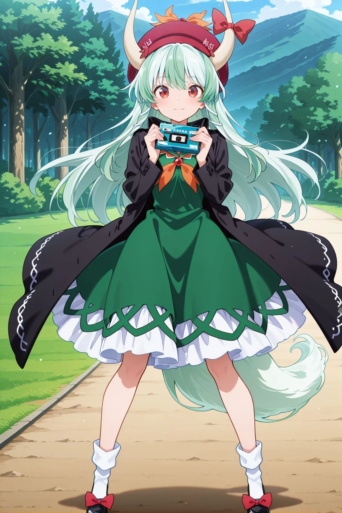 kamishirasawa keine, 1girl, solo, red eyes, green hair, long hair, horns, green tail,, ex-keine, horn ribbon, red ribbon, red neckerchief, red brooch, green dress, puffy short sleeves, petticoat, white socks, black shoes, footwear bow,kamishirasawa keine, 1girl, solo, red eyes, green hair, long hair, horns, green tail,, ex-keine, kamishirasawa keine \(kaiju of rumors and speculation\), alternate costume, red hat, red beret, horn ribbon, red ribbon, black coat, open coat, long sleeves, orange neckerchief, green dress, petticoat, white socks, black shoes, footwear bow, holding cassette tape,Description