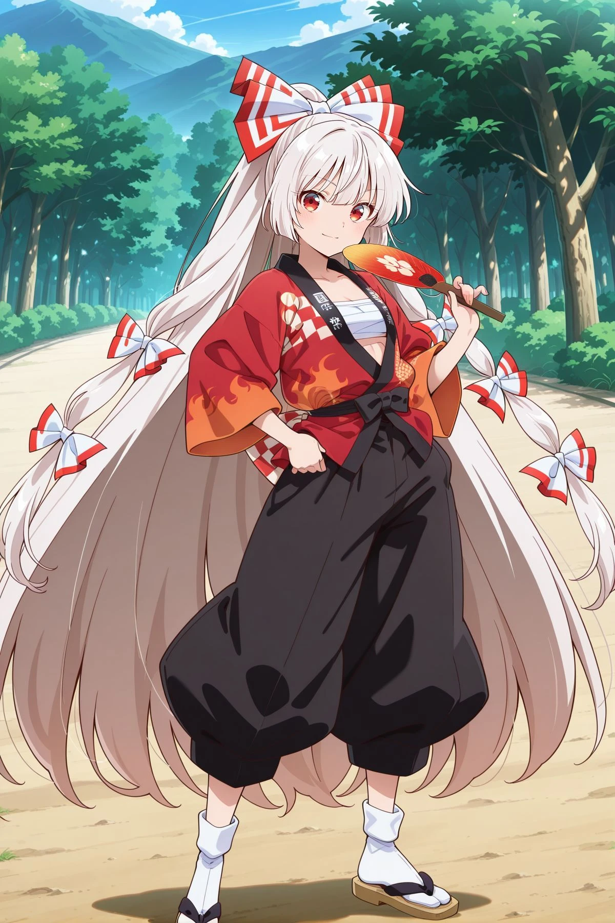 fujiwara no mokou, 1girl, solo, red eyes, white hair, very long hair, small breasts,hair bow, white bow, multiple hair bows, white shirt, long sleeves, red suspenders, red pants, red shoes,Optional :