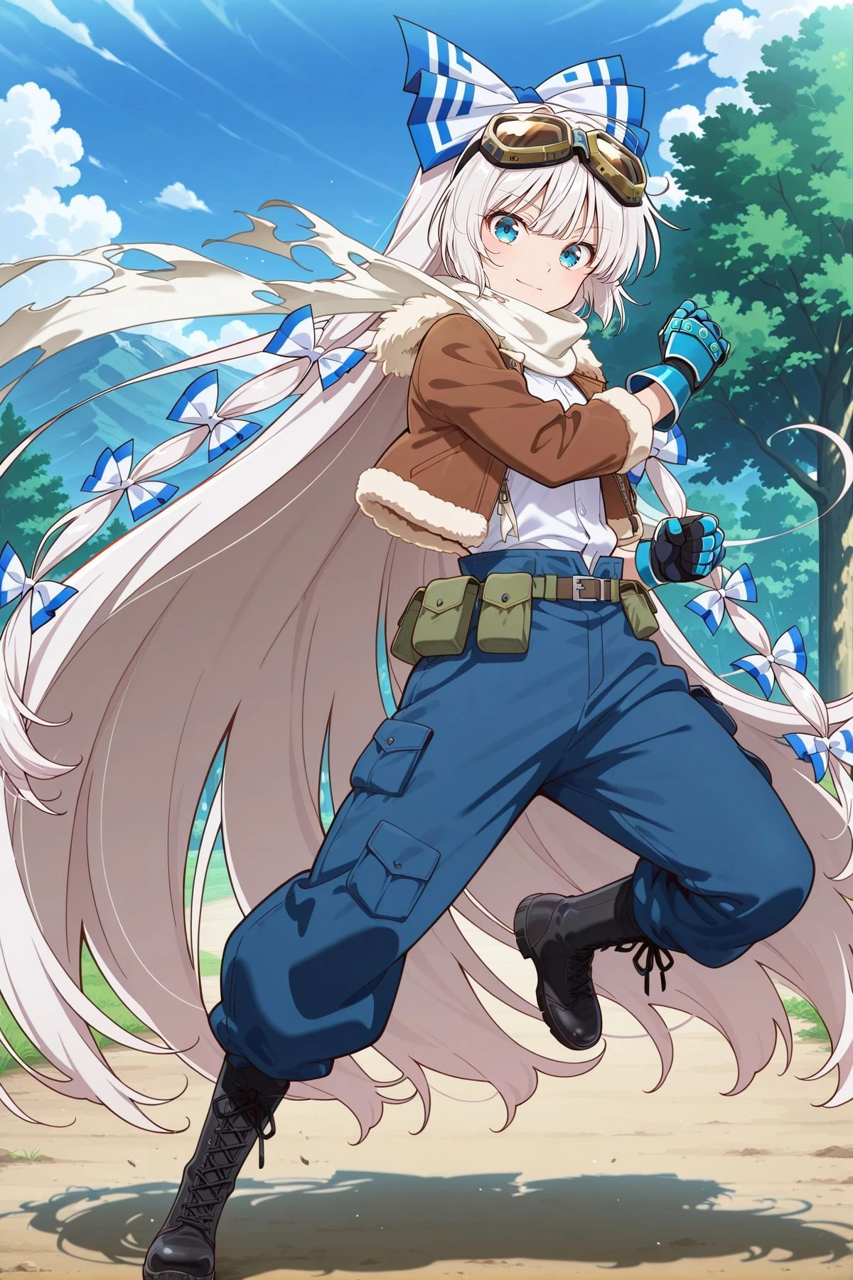 fujiwara no mokou, 1girl, solo, blue eyes, white hair, very long hair, fujiwara no mokou \(defiant blue phoenix\), alternate costume, multiple hair bows, blue bow, goggles on head, white scarf, torn scarf, brown jacket, open jacket, fur-trimmed jacket, white shirt, blue gloves, armored gloves, belt pouch, blue pants, pocket, black boots, lace-up boots,Fujiwara no Mokou (Hourai Heat Pump) :