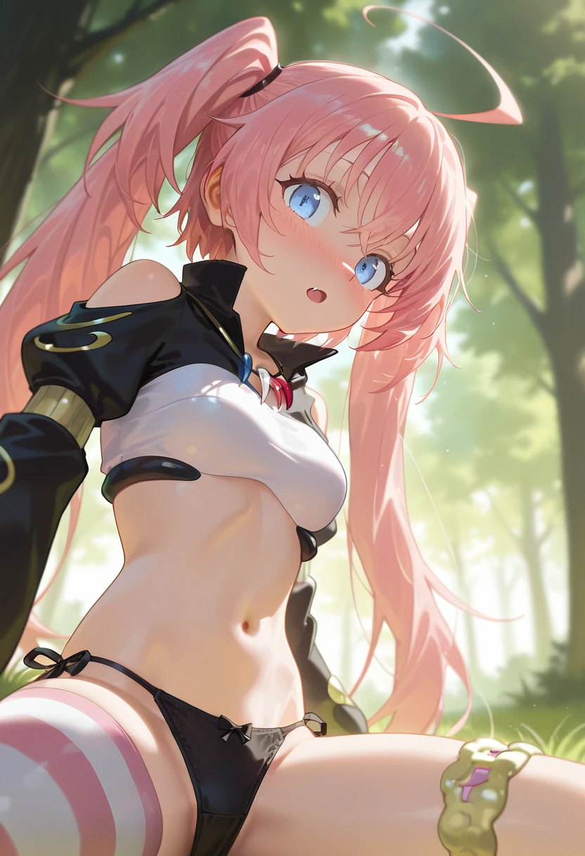 Tags for her outfit: long sleeves, puffy sleeves, midriff, black jacket, crop top, black panties, thigh strap, striped thighhighs, single thighhigh, side-tie panties, bow panties, asymmetrical legwear, shrug (clothing), shoulder cutout, uneven legwear, thighlet, necklace,