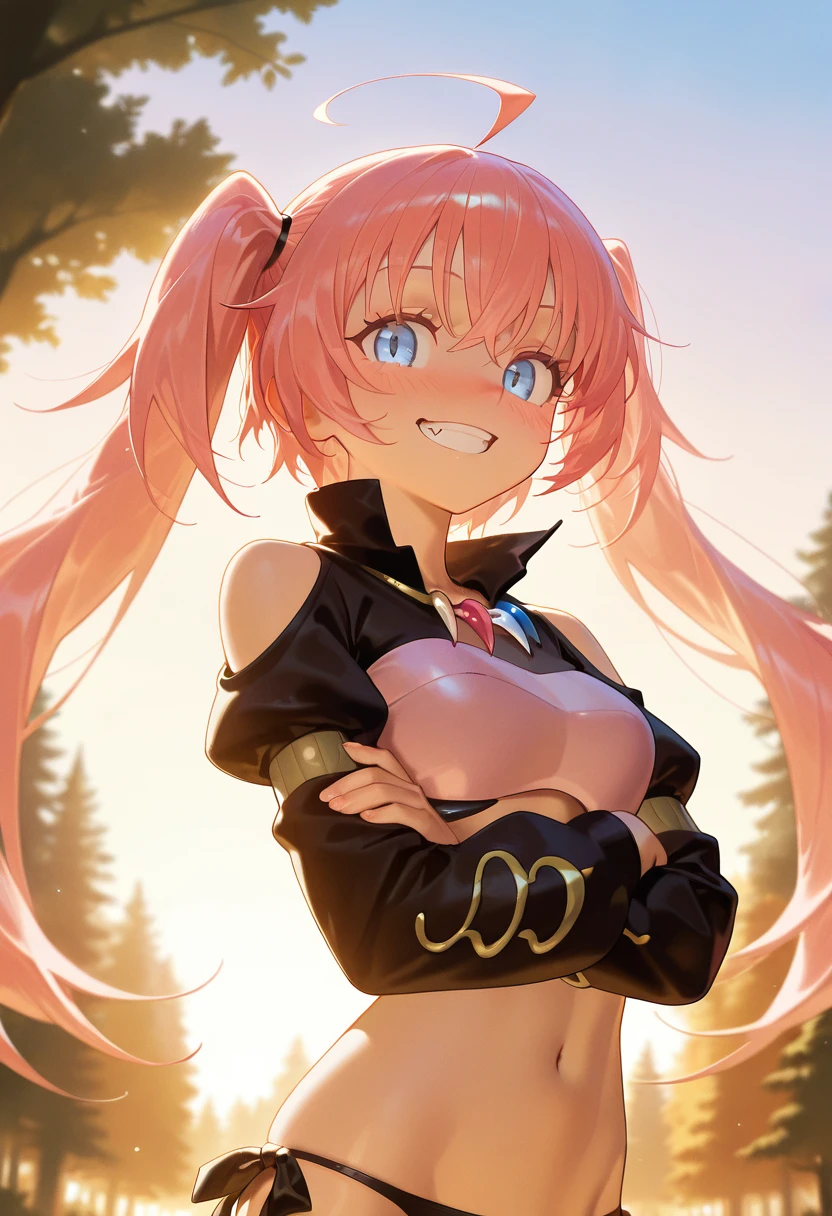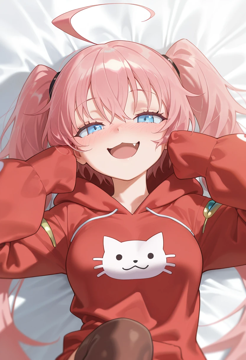 1girl, solo, blue eyes, hair between eyes, very long hair, twintails, pink hair, ahoge, fang, medium breasts,