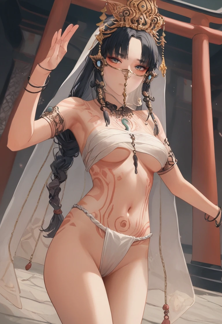 Some tag I used for training: tiara, cape, black hair, hair ornament, japanese clothes, jewelry, short eyebrows, hikimayu, upper body, earrings, tassel, mouth veil, prayer hands, palms together.