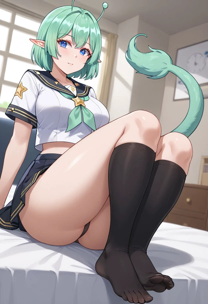 antennae, medium hair, green hair,pointy ears,blue eyes, tail, large breasts,