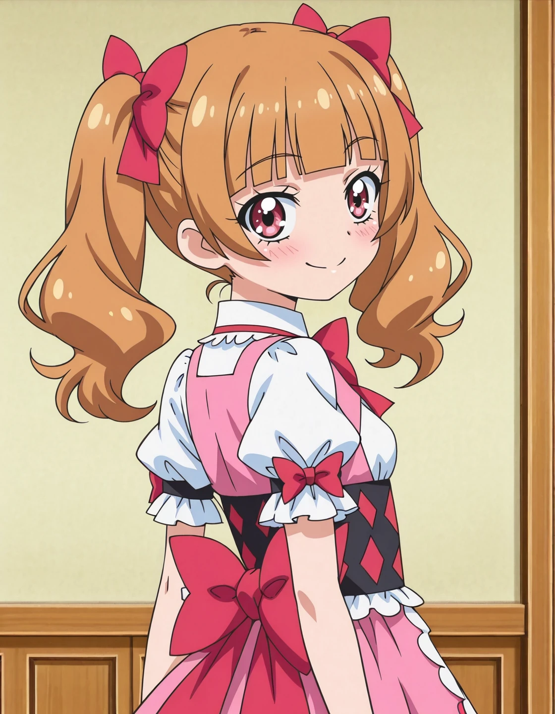 anime screencap, solo,1girl,emirunormal,aisakiemiru,pink dress,<lora:aisakiemiru_IL:0.8>, high definition,amazing quality,best quality,very aesthetic,masterpiece,absurdres